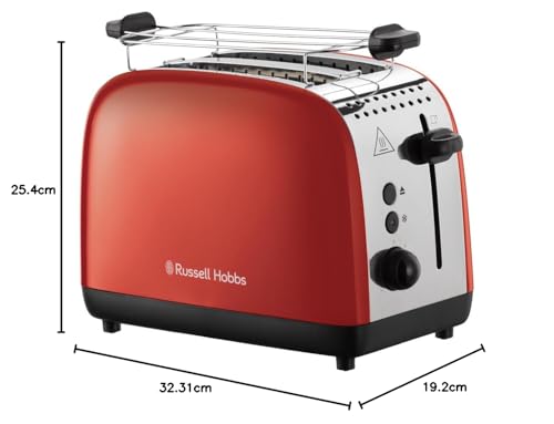 Einzelheiten: Der Colours Plus+ Toaster überzeugt durch sein Design in hochwertig lackiertem roten Edelstahl. Der Colours Plus+ Toaster in rot mit 2 extra breiten Toastschlitzen verfügt über 6 Bräunungsstufen und bietet mit Stopp-, Aufwärm-, und Auftaufunktion sowie einem Brötchenaufsatz alle wichtigen Ausstattungsmerkmale für leckeren Toast und einen genussvollen Start in den Tag. Die "Lift and Look"-Funktion des 1.600 Watt Toasters ermöglicht außerdem ein Anschauen des Toasts während des Röstens, ohne den Vorgang zu unterbrechen und die Hebefunktion sorgt zusätzlich für die sichere Entnahme der Brotscheiben.