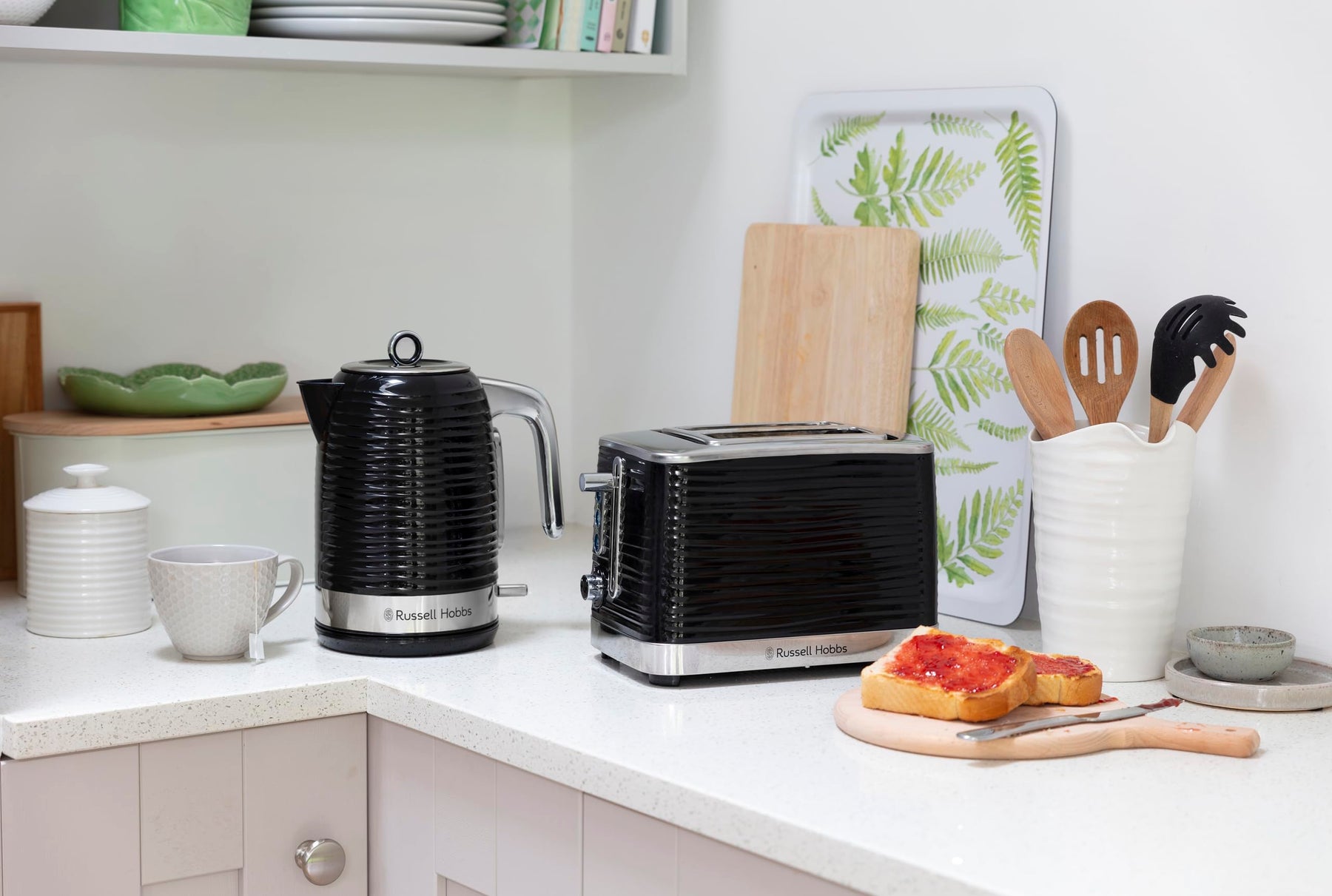 Einzelheiten: Die Frühstücksserie Inspire in der Farbe Schwarz besticht durch ihr strukturiertes Design und passt so in jede Küche. Zusätzlich sind alle Produkte mit hochwertigen Ausstattungsmerkmalen ausgestattet und machen die Serie zu einem echten Highlight. Dank der brillanten Gestaltung aus hochwertigem, schwarzen Kunststoff mit Chromapplikationen ist der 1. 050 Watt starke Inspire Toaster ein wahrer Blickfang in der Küche. Für einen individuell wählbaren Röstgrad ist das Gerät mit sechs Bräunungsstufen ausgestattet. Die Hebefunktion sorgt für eine sichere Entnahme der Brotscheiben. Der Toaster verfügt darüber hinaus über einen Brötchenaufsatz, eine Stopp-, Auftau- und Aufwärmfunktion sowie eine praktische Krümelschublade.