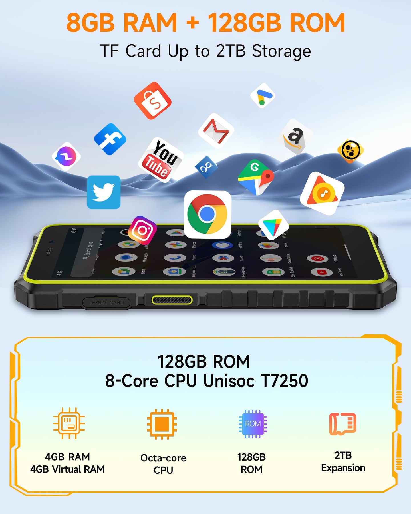 • 🎄【Android 15 & Octa-Core & 8 GB + 128 GB/2 TB】Das Ulefone Rugking 2 Pro ist mit einem UNISOC T7250 Octa-Core-Prozessor ausgestattet und lĂ€uft mit Android 15 fĂŒr ein flĂŒssiges und ruckelfreies Nutzererlebnis. Es bietet 8 GB RAM (4 GB RAM + 4 GB VRAM) und 128 GB ROM, erweiterbar auf bis zu 2 TB per microSD-Karte – fĂŒr mĂŒheloses Herunterladen und Teilen.