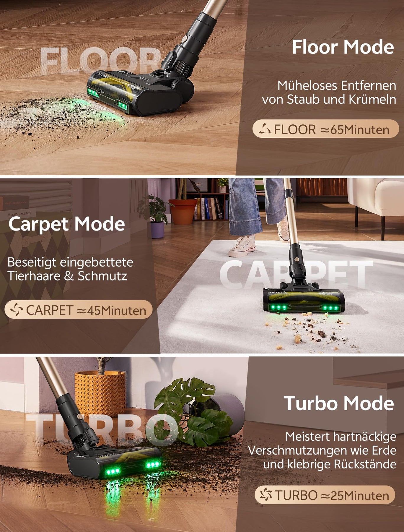 - 【50 KPA SAUGLEISTUNG & 65 MIN AKKU】Der kabellose Staubsauger U15 bietet starke 50 kPa Saugkraft für hartnäckige Tierhaare, Krümel und Schmutz. Mit bis zu 65 Minuten Laufzeit im Eco-Modus (45 Min. Standard/25 Min. Max) dank wechselbarem Akku – ideal für große Wohnungen und alle Bodenbeläge!