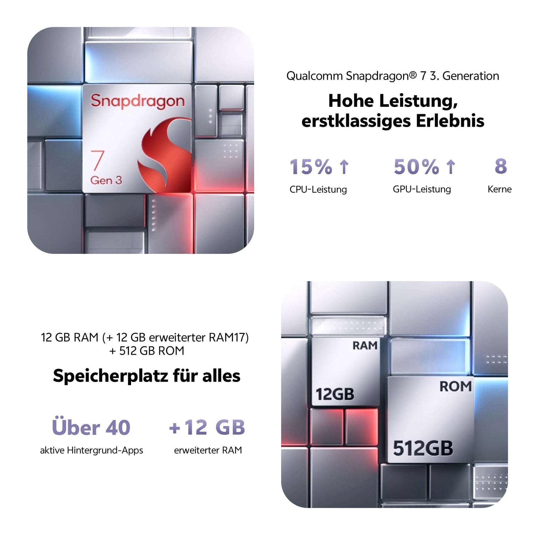 - Flaggschiff-Leistung für nahtloses Multitasking: Das Smartphone wird von einem Qualcomm Snapdragon 7 Gen 3 Chipsatz angetrieben, verfügt über 12 GB RAM (+12 GB Erweiterter RAM) und 512 GB Speicher für blitzschnelle Performance. Wechseln Sie mühelos zwischen über 40 Apps ohne Verzögerung – ideal für Produktivität und Gaming.