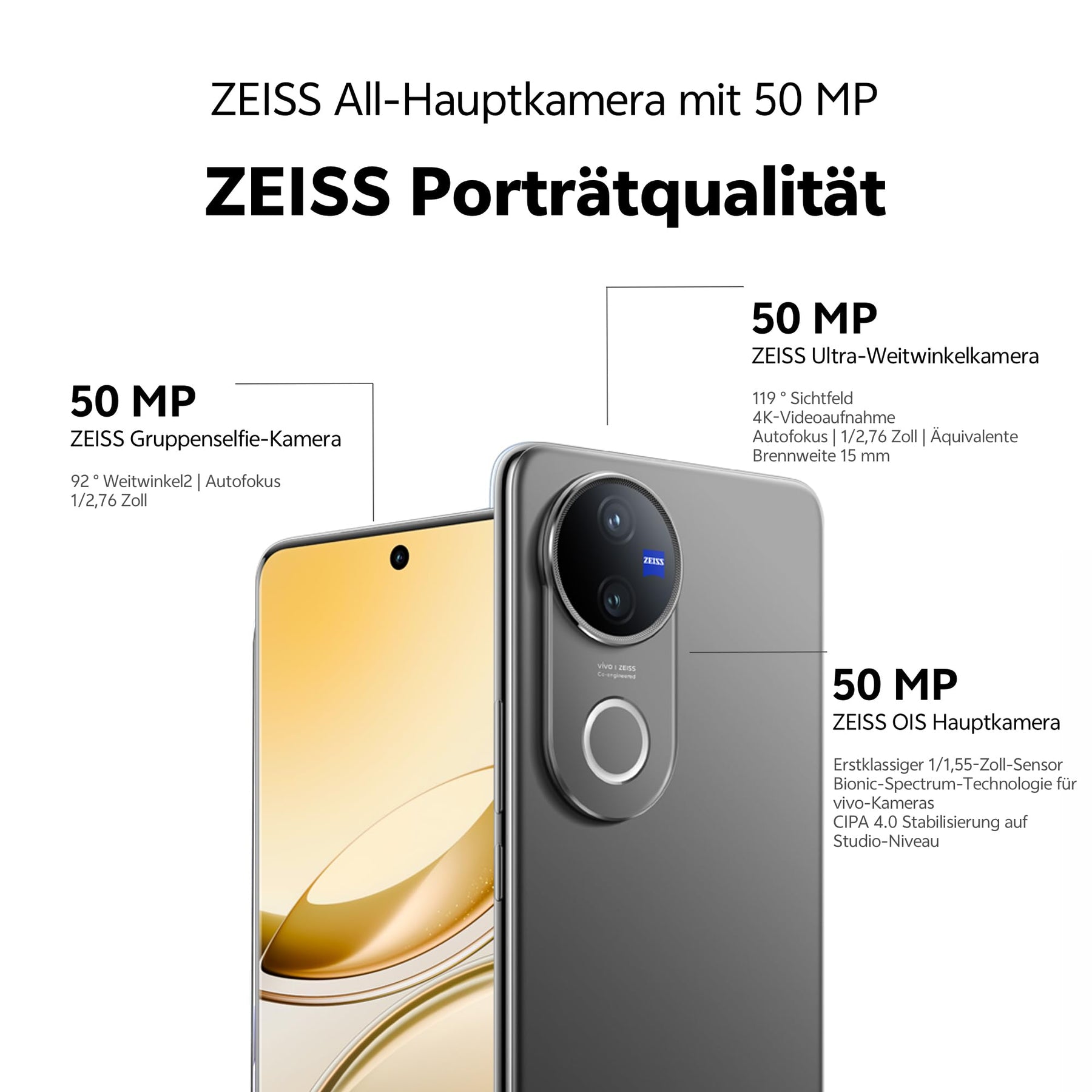 - Dreifaches 50 MP ZEISS-Kamerasystem: Das vivo V50 Smartphone mit einer 50 MP Ultra-Weitwinkelkamera, einer 50 MP OIS-Hauptkamera und einer 50 MP Gruppen-Selfiekamera erfasst jedes Detail. Die Linsen wurden gemeinsam mit ZEISS für professionelle Porträts entwickelt – atemberaubende Aufnahmen in jedem Setting!