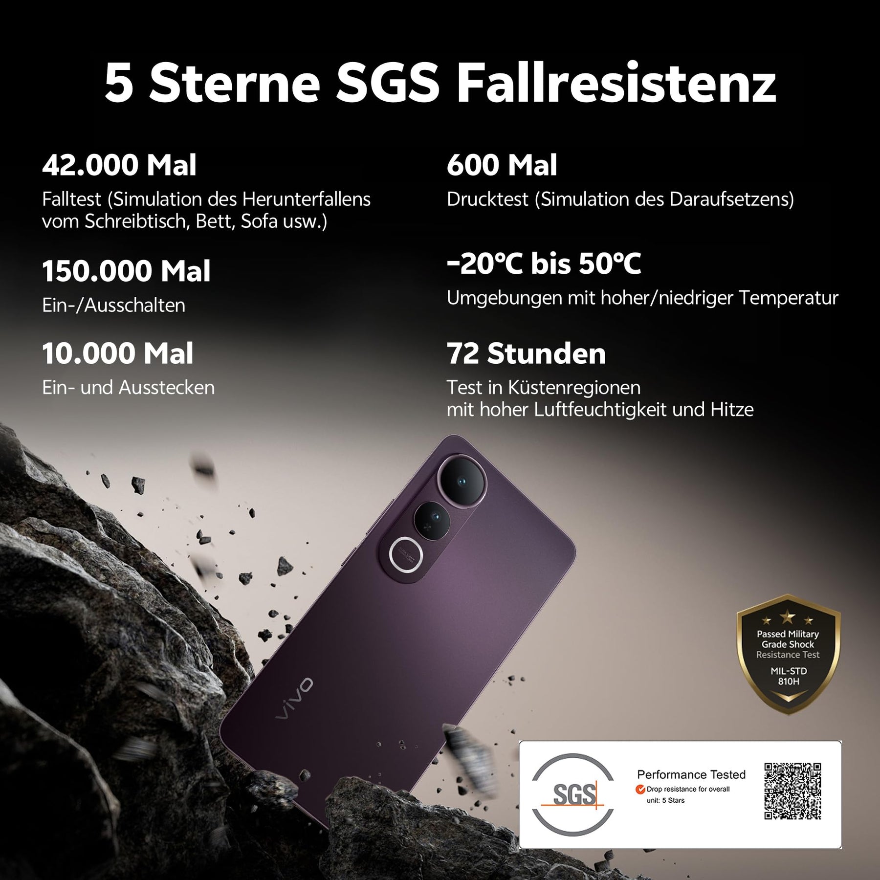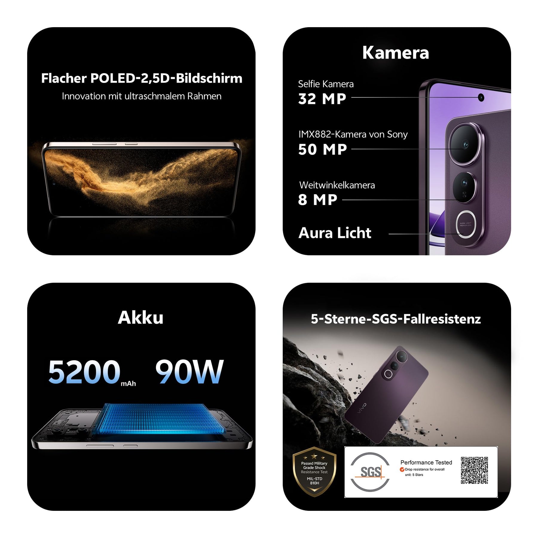 - 【 SGS Fünf-Sterne-Sturzsicherheit + IP65 Wasser- und Staubschutz 】 Dank einer umfassenden Dämpfungsstruktur und gehärtetem Schutzglas ist das vivo V50 Lite auf Langlebigkeit im Alltag ausgelegt. In Kombination mit einer speziell entwickelten Schutzhülle mit vier Ecken Air-Cushion-Technologie verbessert es den Schutz des Bildschirms und widersteht unerwarteten Stürzen und Stößen. Mit der IP65-Zertifizierung trotzt es Spritzwasser und Staub. Das vivo V50 Lite bietet zuverlässigen Schutz, ohne dass Sie sich Sorgen um Schäden an Ihrem Smartphone machen müssen.