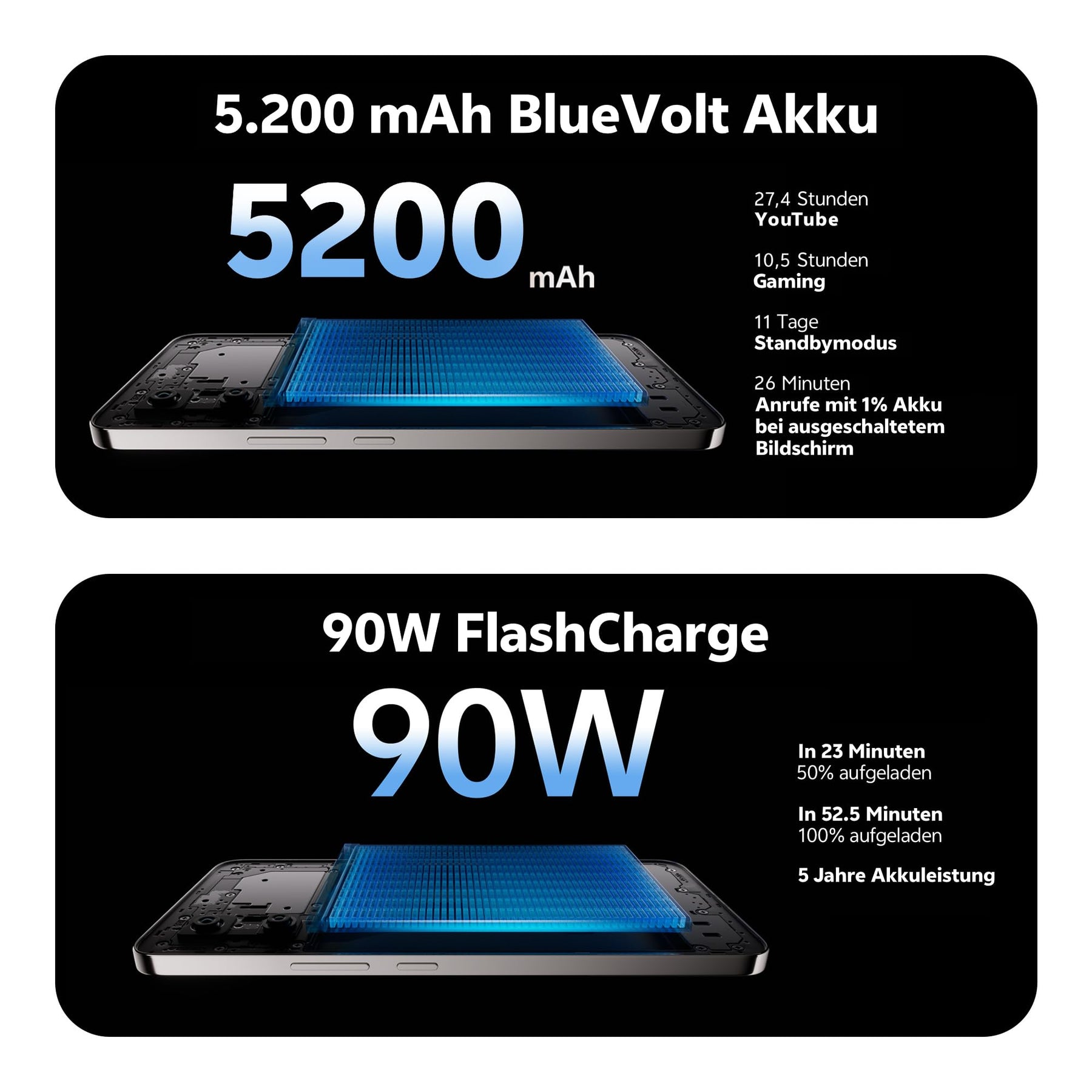 - 【5200 mAh Ultra-Slim BlueVolt Akku + 90W FlashCharge】 Der 5200 mAh BlueVolt Akku des V50 Lite sorgt für eine langanhaltende Leistung in einem schlanken und kompakten Design. Fortschrittliche Versiegelungstechnologien und eine optimierte Energiedichte gewährleisten eine konstante Stromversorgung, sodass du ohne Unterbrechung streamen, spielen und in Verbindung bleiben kannst. Die 90W FlashCharge-Technologie ermöglicht ein ultraschnelles Aufladen von 0 auf 100 % in nur 52,5 Minuten. Dank des 24-dimensionalen Sicherheitskonzepts werden Spannung, Stromstärke und Temperatur.