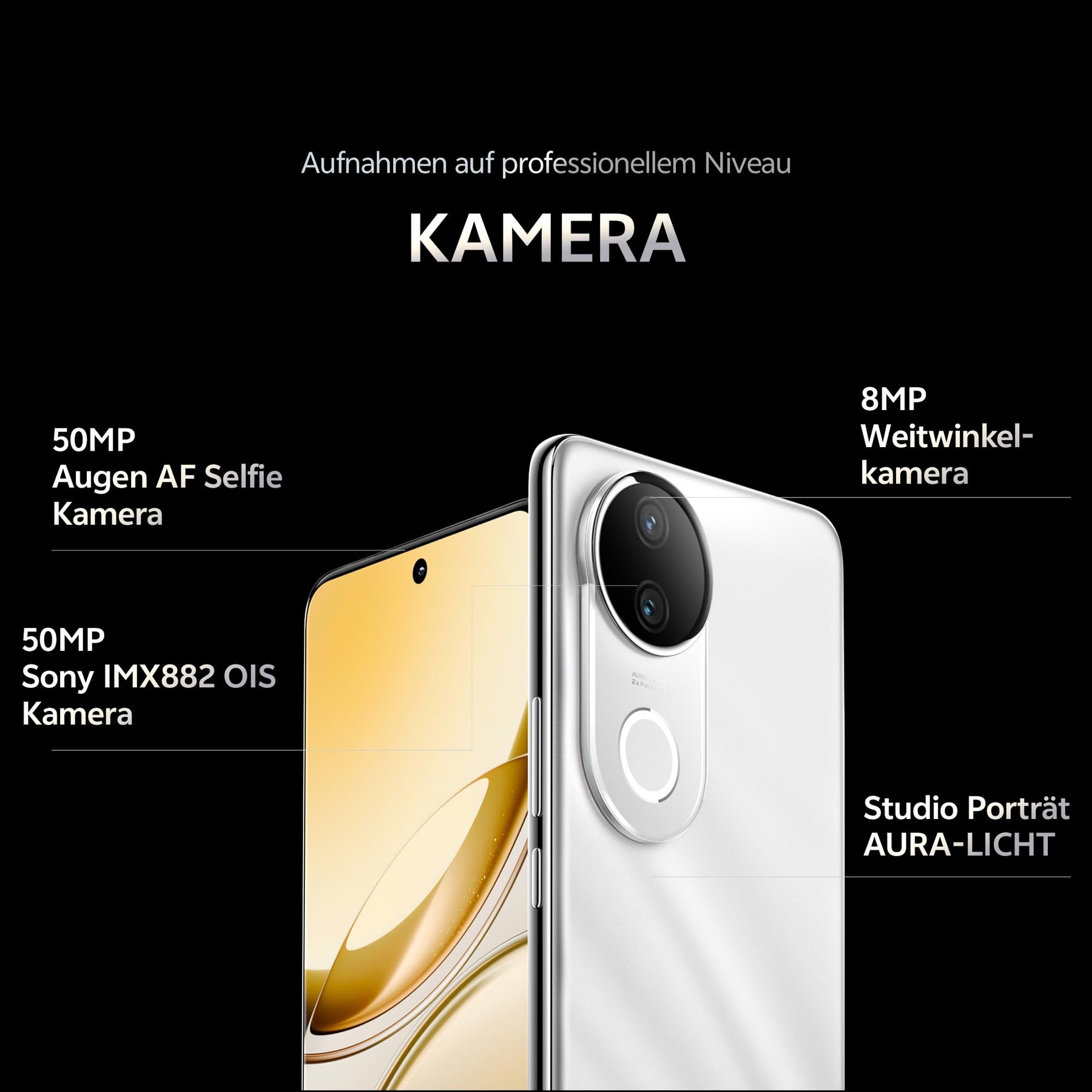 - 【Studio-Qualität Aura Light Porträt】 Egal ob bei warmen oder kühlen Lichtverhältnissen – das V50e passt sich nahtlos deiner Umgebung an, reduziert Licht von externen Quellen und harmonisiert Farben mit der Umgebung. Kein harter Glanz, sondern ein sanfter, natürlicher Schein, der jedes Foto mühelos schön aussehen lässt – unabhängig von den Lichtverhältnissen.