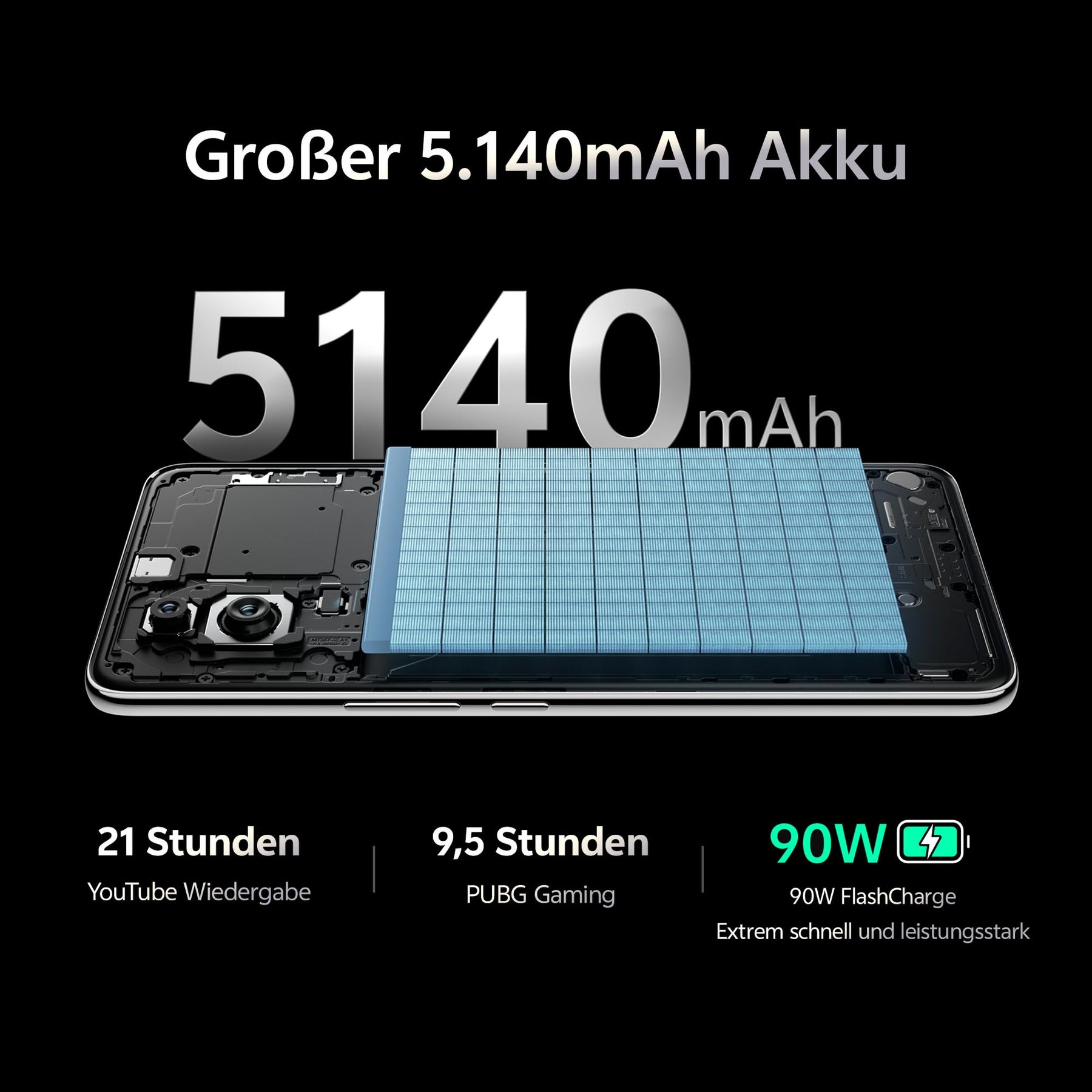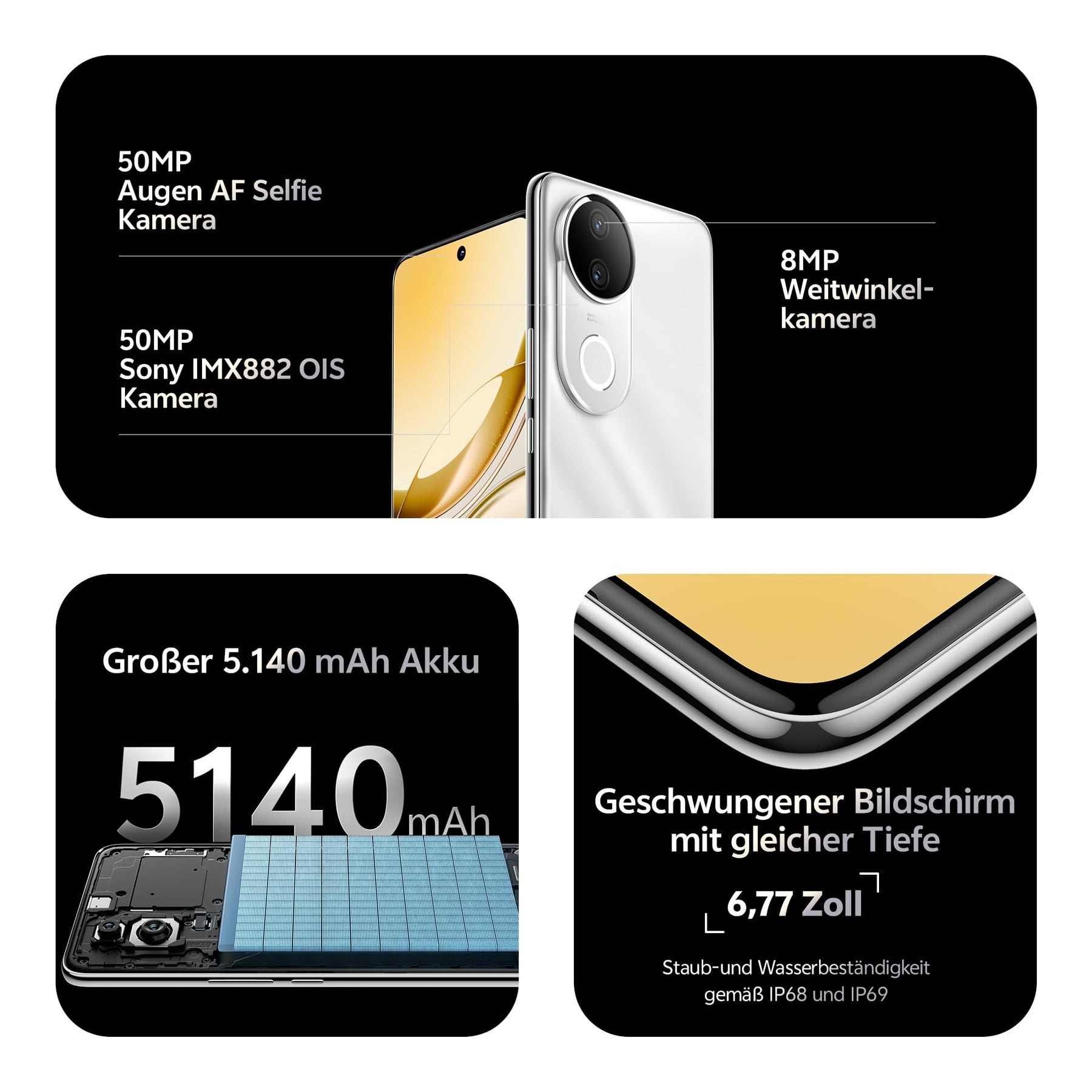 - 【Ultralange Akkulaufzeit】 Das V50e bleibt schlank und verfügt über einen leistungsstarken 5140 mAh BlueVolt-Akku, der den ganzen Tag über durchhält. Verabschiede dich von Powerbanks für Arbeit oder Shopping. Mit der 90W Schnellladefunktion erhältst du mit nur 10 Minuten Ladezeit von 1 % bis zu 6 Stunden Gesprächszeit. Innovative Materialien und selbst entwickelte Algorithmen gewährleisten eine Akkulebensdauer von bis zu 4 Jahren.