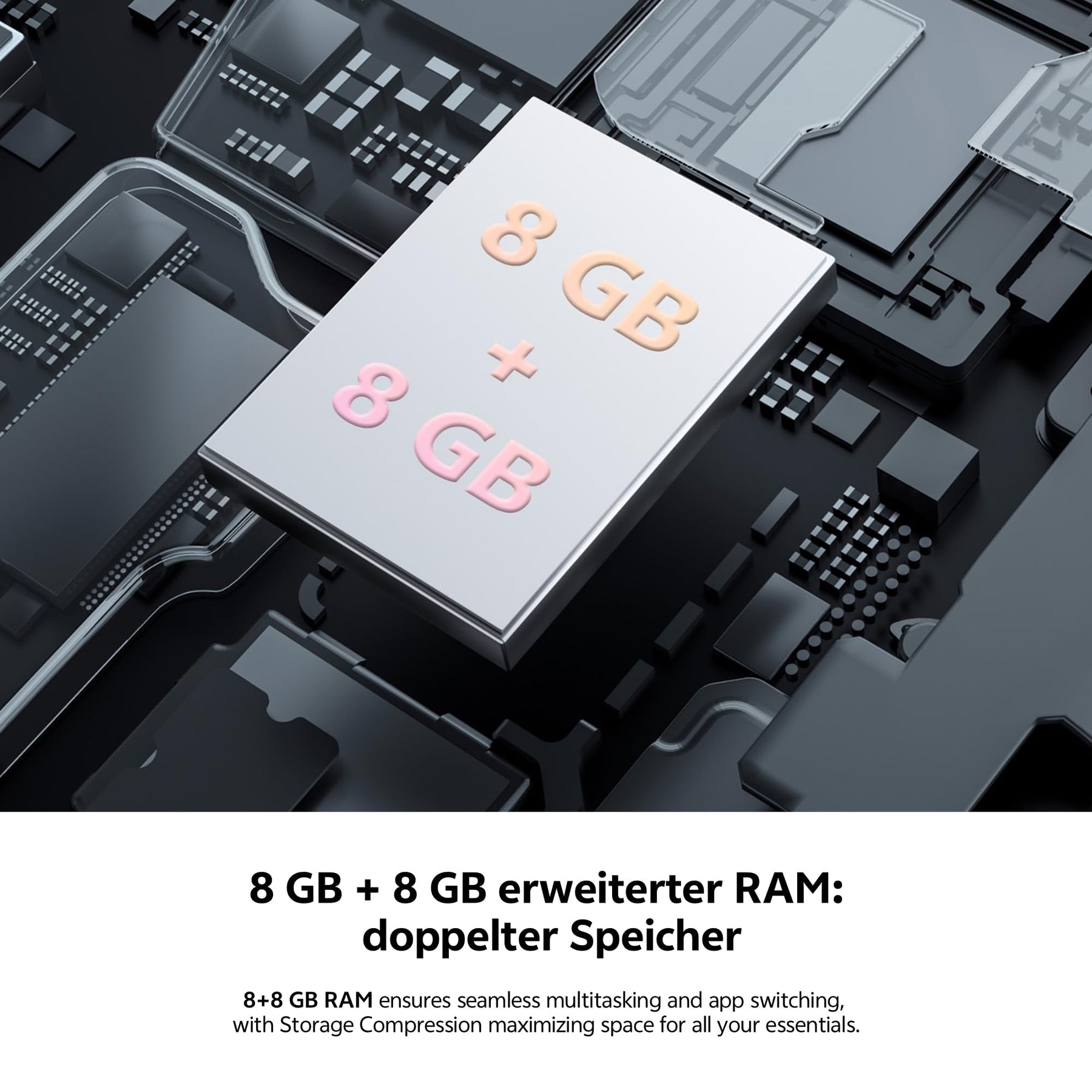 - 【 Reibungslose Performance 】 Dank 8 GB RAM + 8 GB erweitertem RAM wird müheloses Multitasking ermöglicht, sowie ruckelfreies Gaming und flüssige App-Wechsel. Der 128 GB große Speicher bietet ausreichend Platz für jegliche Apps, Medien und festgehaltene Erinnerungen. Optimierte Geschwindigkeit und Effizienz sorgen für eine reibungslose Nutzung – egal ob beim Streamen, Arbeiten oder Spielen.