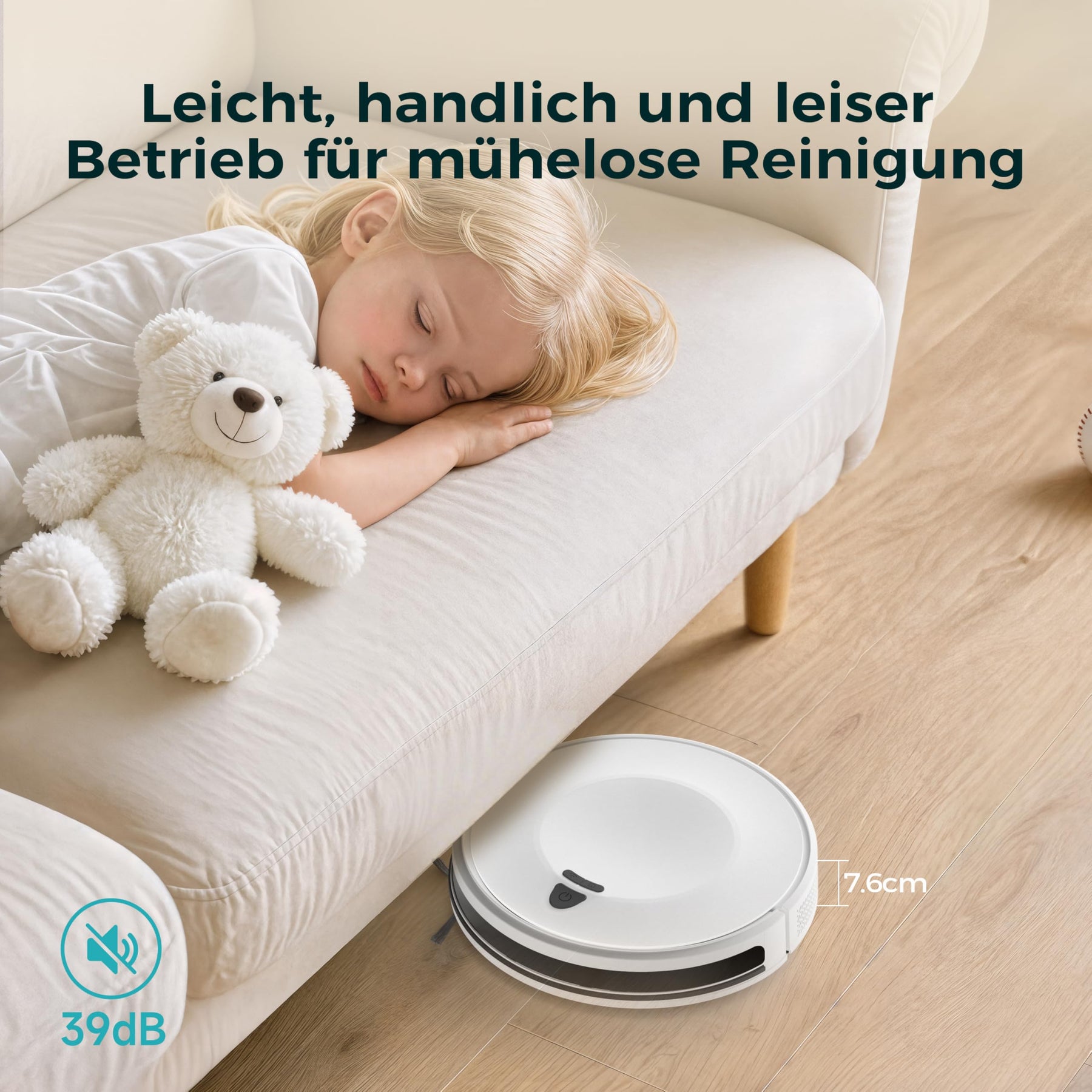 • 🛋 𝐔𝐥𝐭𝐫𝐚𝐥𝐞𝐢𝐜𝐡𝐭 & 𝐟𝐥𝐚𝐜𝐡 – 𝐒𝐚𝐮𝐛𝐞𝐫 𝐚𝐮𝐜𝐡 𝐝𝐨𝐫𝐭, 𝐰𝐨 𝐦𝐚𝐧 𝐬𝐨𝐧𝐬𝐭 𝐧𝐢𝐜𝐡𝐭 𝐡𝐢𝐧𝐤𝐨𝐦𝐦𝐭 Mit nur 7,6 cm Höhe fährt der Roboter mühelos unter Betten, Sofas und Schränke. Genau dort, wo sich Staub, Haare und Allergene sammeln. Kein Möbelrücken, keine vergessenen Ecken – dein Zuhause bleibt automatisch hygienisch sauber und spürbar frischer.
