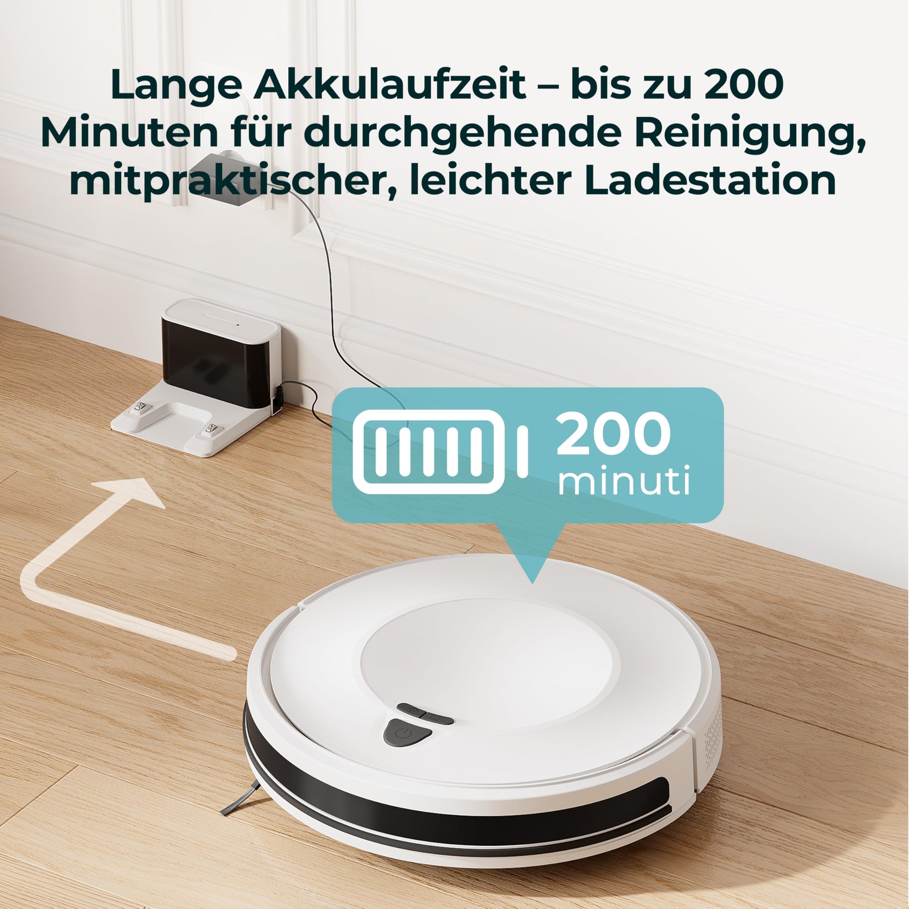 • ⏱ 𝐁𝐢𝐬 𝐳𝐮 𝟐𝟎𝟎 𝐌𝐢𝐧𝐮𝐭𝐞𝐧 𝐋𝐚𝐮𝐟𝐳𝐞𝐢𝐭 – 𝐑𝐞𝐢𝐧𝐢𝐠𝐭 𝐠𝐫𝐨ß𝐞 𝐖𝐨𝐡𝐧𝐮𝐧𝐠𝐞𝐧 𝐢𝐧 𝐞𝐢𝐧𝐞𝐦 𝐃𝐮𝐫𝐜𝐡𝐠𝐚𝐧𝐠Dank der verlängerten Akkulaufzeit von bis zu 200 Minuten eignet sich der Staubsaugerroboter perfekt für größere Wohnflächen. Keine ständigen Ladepausen, kein Unterbrechen – einfach starten und erledigt zurücklehnen. Mehr Zeit für dich, weniger Gedanken an den Haushalt.