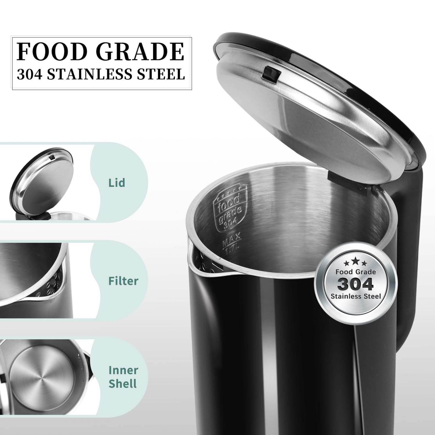 - 【Stainless Steel Wasserkocher, kein Plastik】 Der innere Wasserkocher, der innere Deckel, der Rand und der Ausguss des Teekessels sind alle aus 100% lebensmittelechtem 304 Edelstahl gefertigt, der frei von BPA ist und dafür sorgt, dass kein Rost, kein Plastikgeruch und kein Plastik das heiße Wasser berührt, um sicheres Trinkwasser für Ihre Familie zu garantieren.