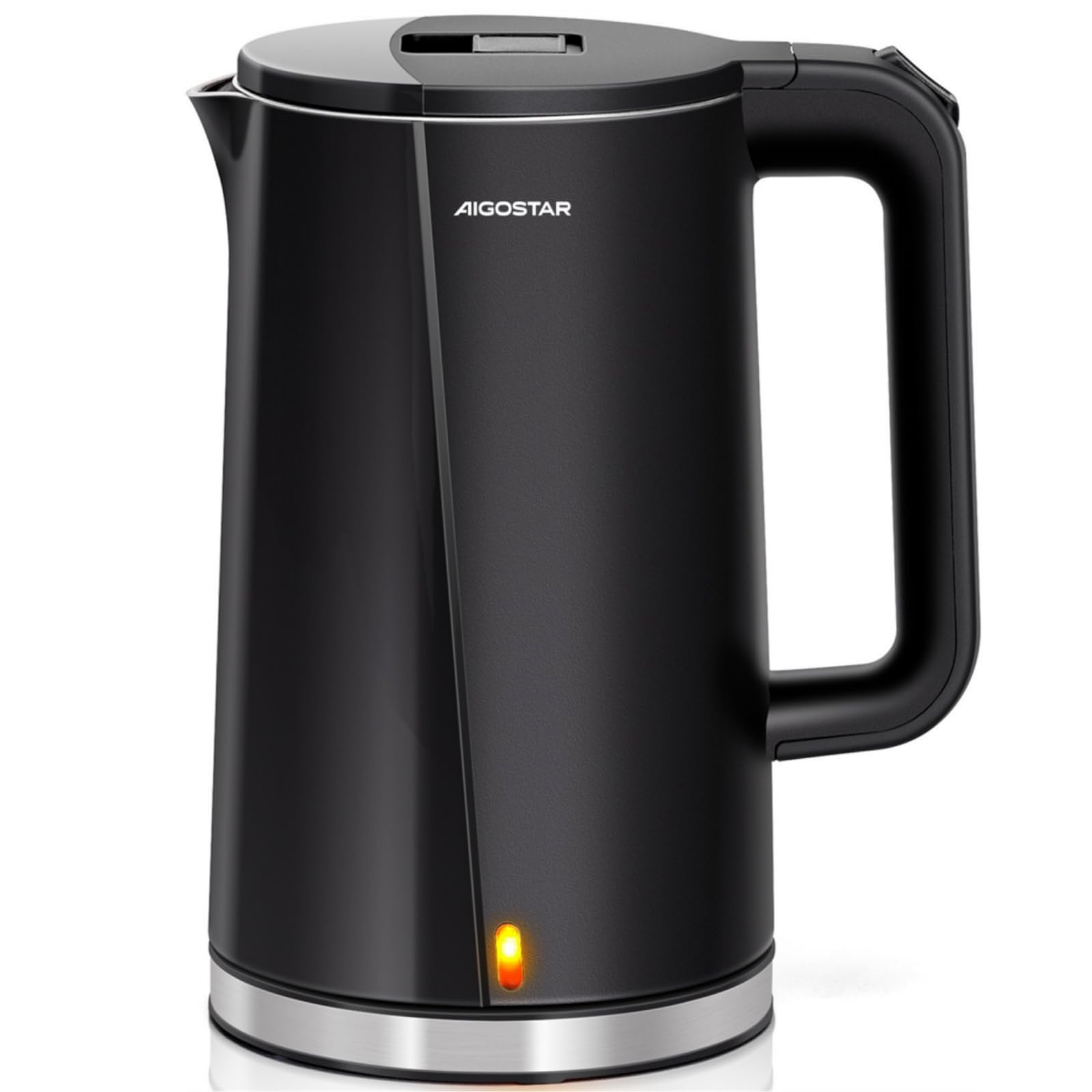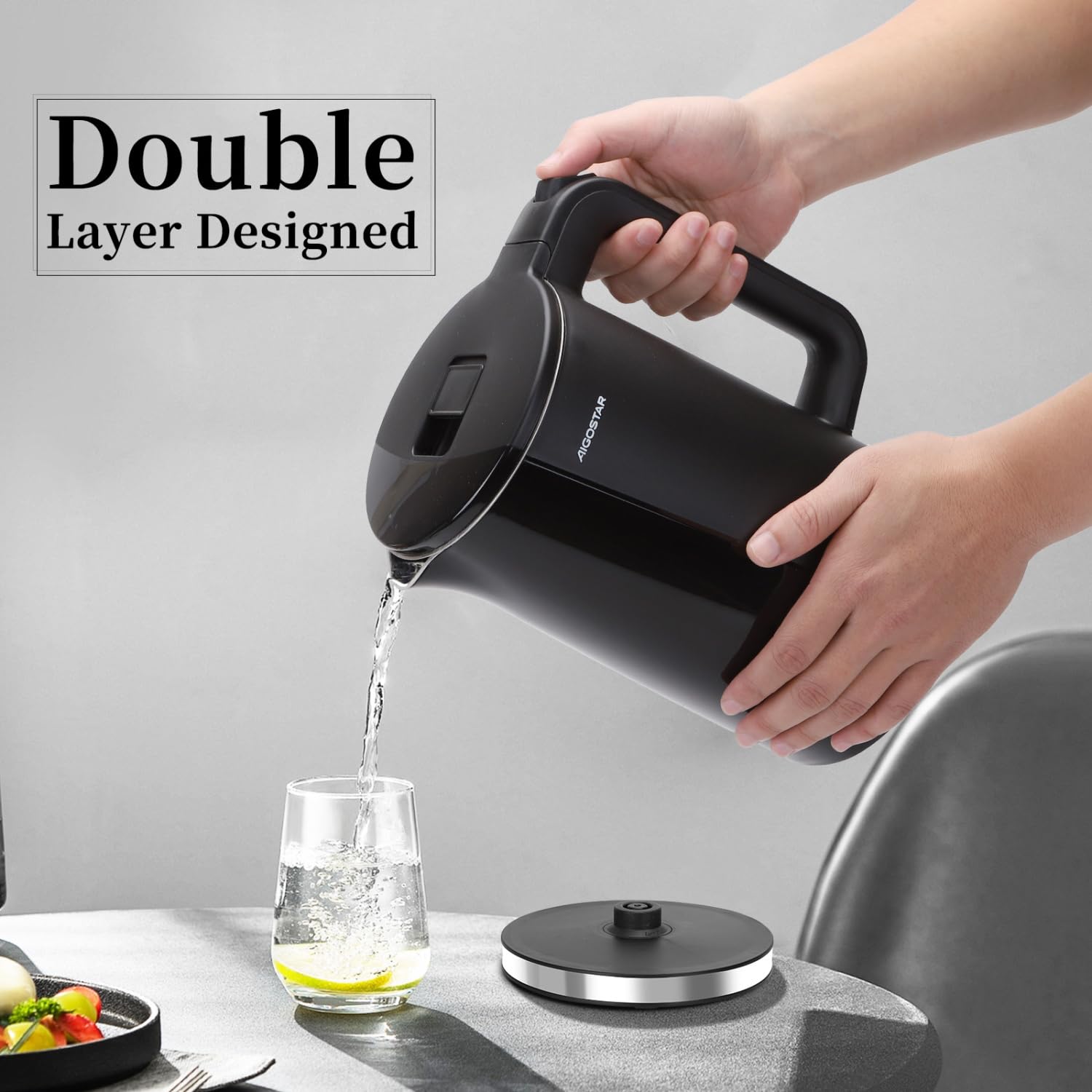 - 【Doppelwand Design】 Der elektrische Wasserkocher ist von einer BPA-freien Kunststoffhülle umgeben, die kühle Außenseite und der Griff machen den Wasserkocher auch beim Kochen sicher zu berühren. Gleichzeitig hält das doppelwandige Design Ihr Getränk warm und die breite obere Öffnung erleichtert das Befüllen.