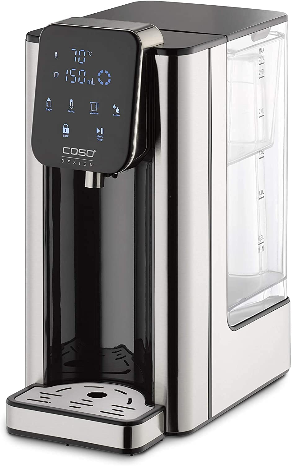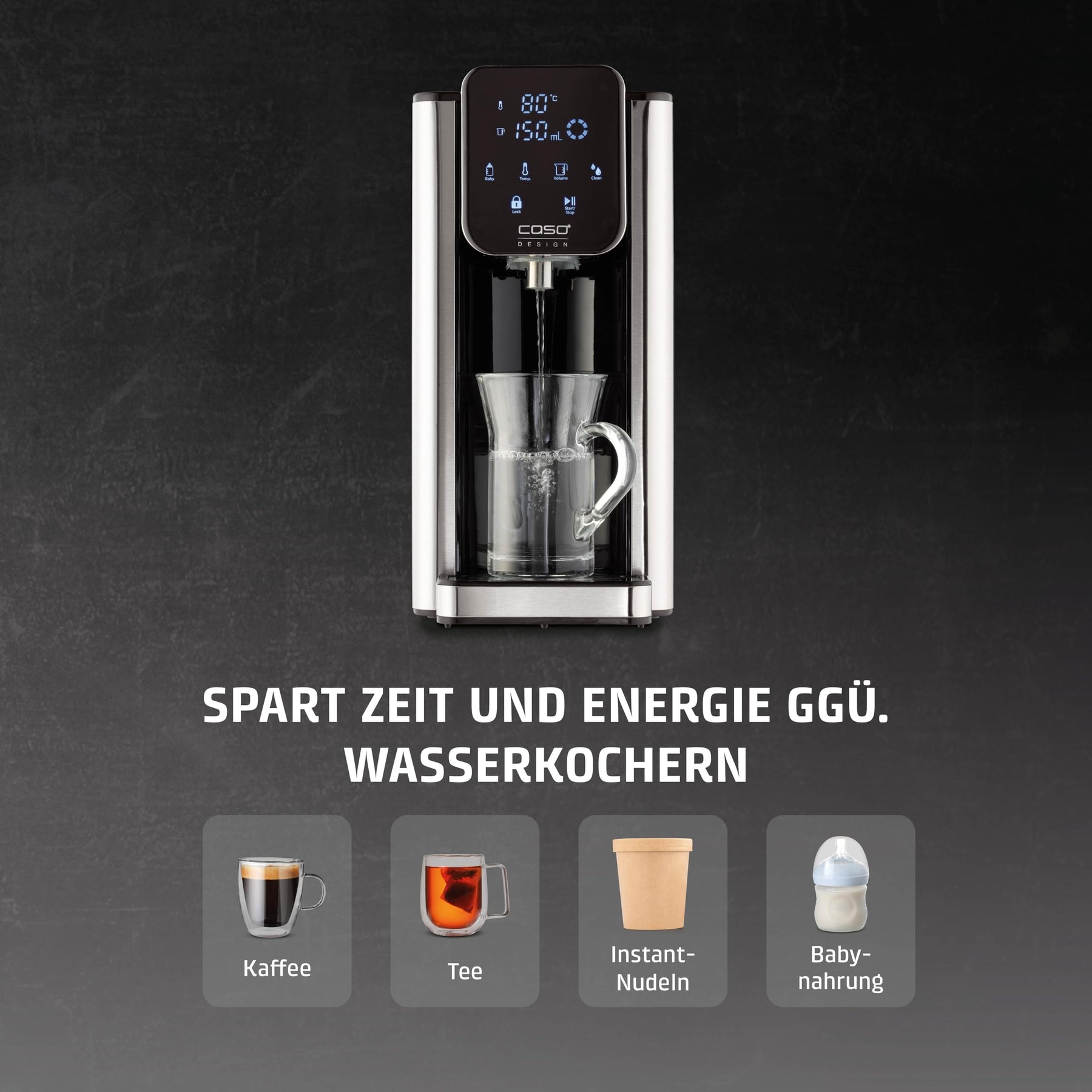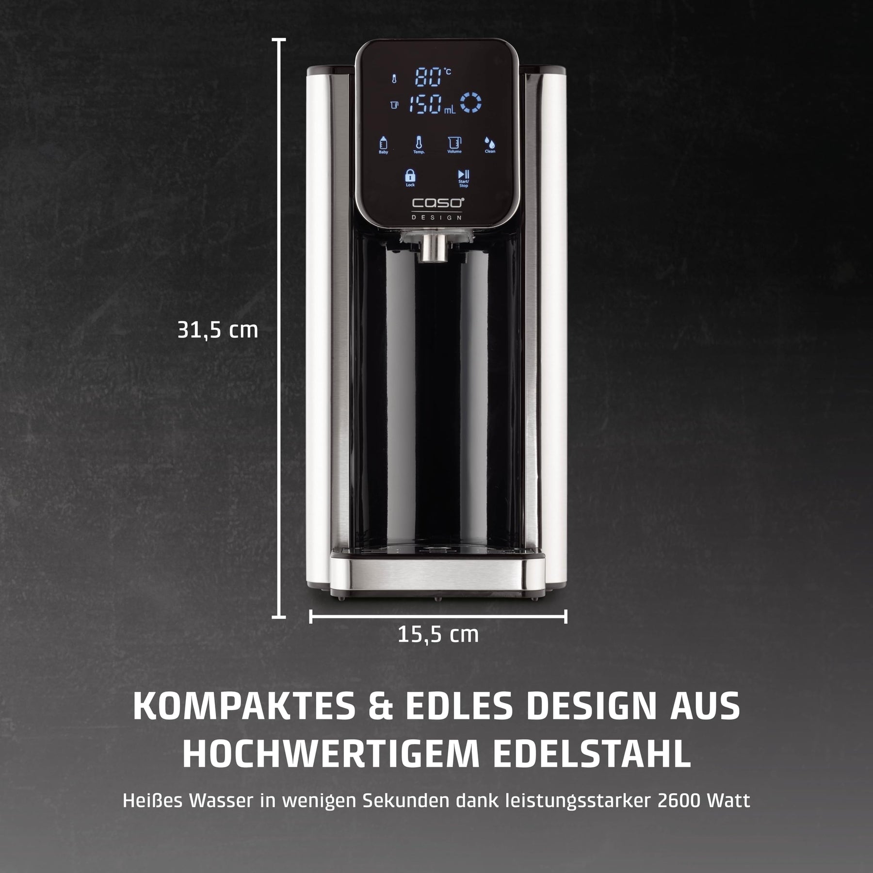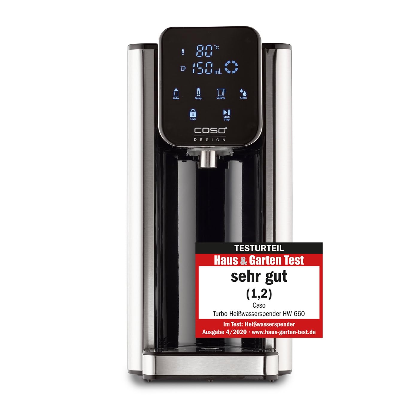 Einzelheiten: Heißes Wasser auf Knopfdruck – einfacher und schneller geht es fast nicht. Im edlen Design in gebürstetem Edelstahl sieht der Turbo Heißwasserspender HW 660 von Caso Design nicht nur ausgesprochen gut aus, sondern spart auch 50% Energie gegenüber einem Wasserkocher ein. Verbrauchen Sie nur noch so viel Wasser, wie Sie benötigen. Auf Knopfdruck liefert der Caso HW 660 Ihnen kontinuierlich heißes Wasser in Sekunden oder Sie entscheiden sich für eine der acht vorgespeichtern Bedarfsmengen (100-400 ml oder kontinierlich). Grade für die Zubereitung von Instant- Getränken und Instant- Gerichten oder Tee ist der Heißwasserspender HW 660 von Caso die perfekte Lösung für Ihre Küche. Zudem ist der Heisswasserspender mit einer Direktwahltaste für die perfekte Zubereitung von Babynahrung (40°C) ausgestattet.