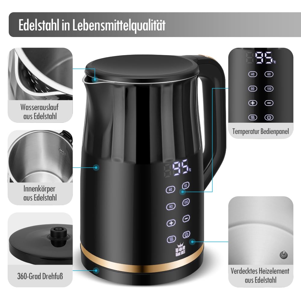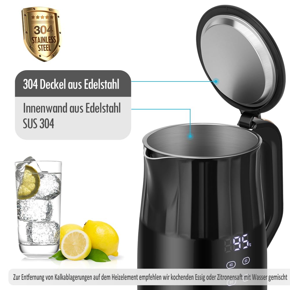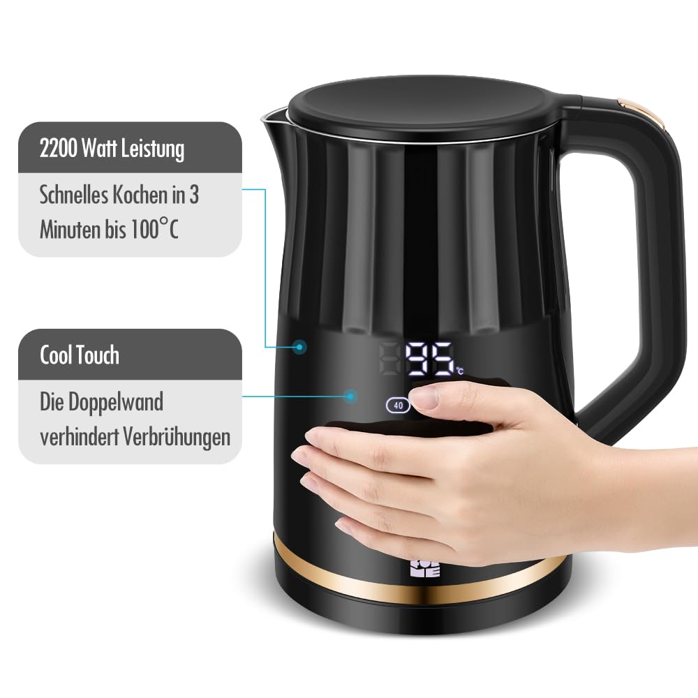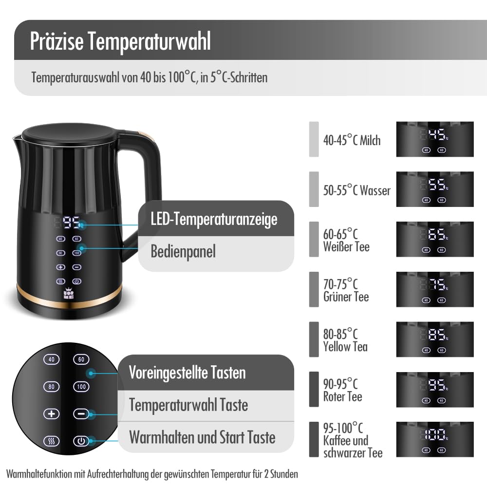 - Warmhaltefunktion mit Aufrechterhaltung der gewünschten Temperatur für 2 Stunden. Mit der Warmhaltefunktion kann jetzt eine Temperatur von 40 bis 100 °C in 5 °C-Schritten eingestellt werden. Die Funktion hält die Wassertemperatur für 2 Stunden aufrecht.