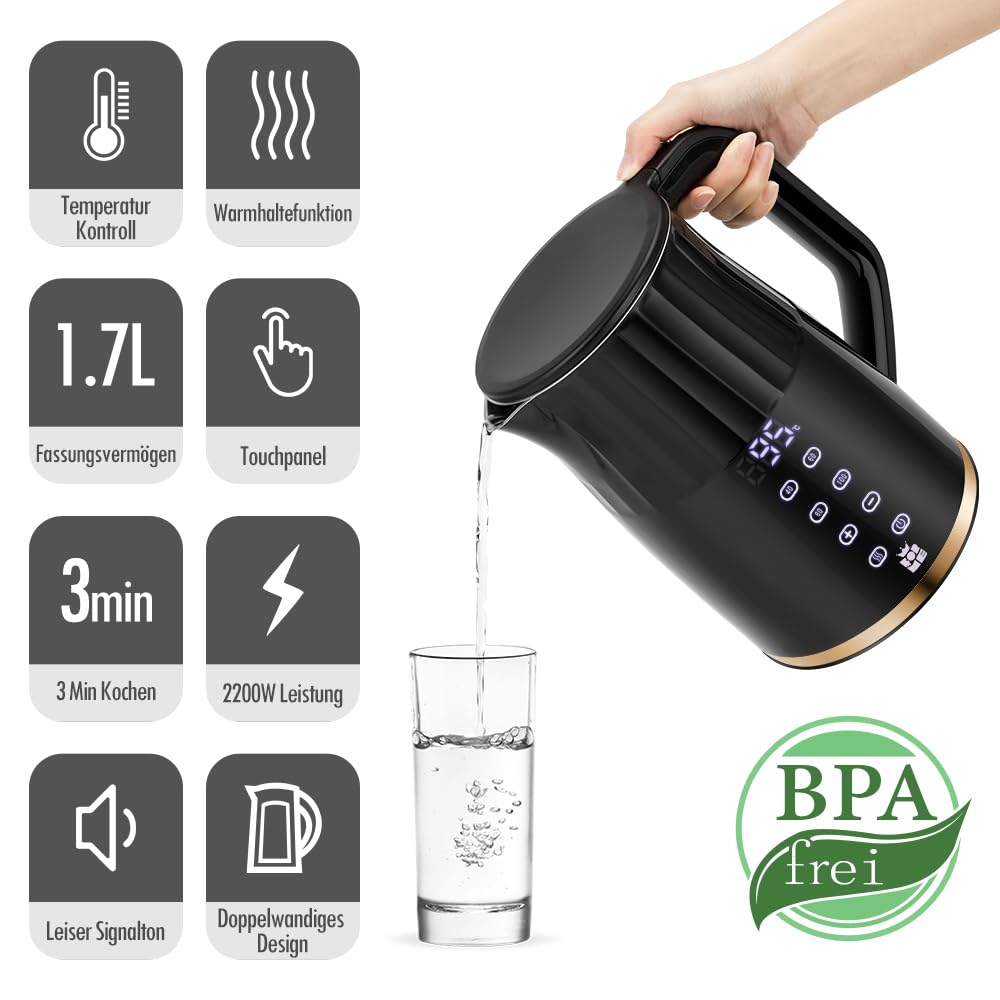 - Automatischer Standby-Modus zum Stromsparen. Doppelwandige Konstruktion, Innenschicht aus SUS304 und Außenschicht aus Kunststoff