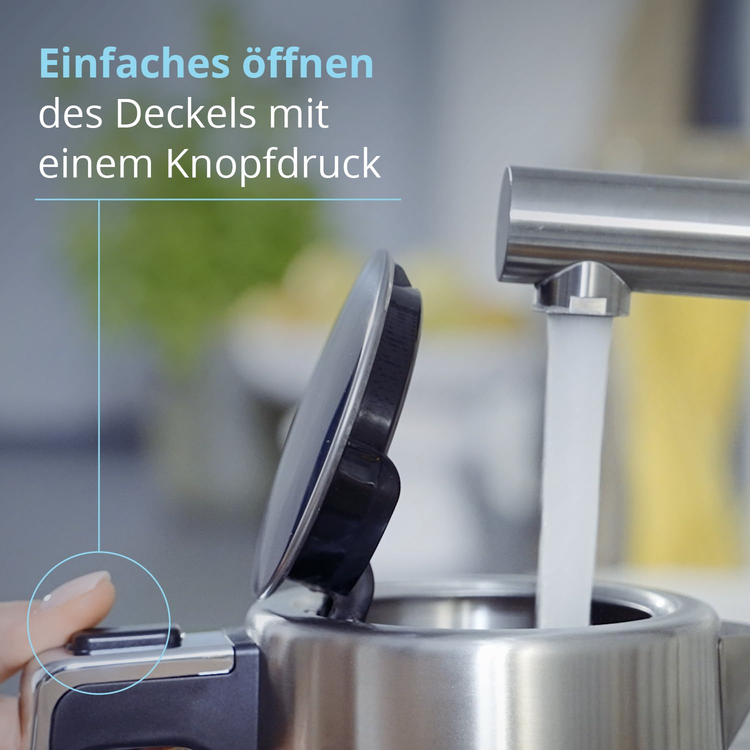 • 𝗟𝗲𝗶𝗰𝗵𝘁 𝘇𝘂 𝗯𝗲𝗱𝗶𝗻𝗲𝗻💧 Der Wasserkocher lässt sich mit einem einzigen Knopfdruck kinderleicht öffnen & befüllen. Außen hat man eine Skala, die die gewünschte Füllmenge kennzeichnet. Zum Einschalten muss man einfach nur den Hebel nach unten drücken.