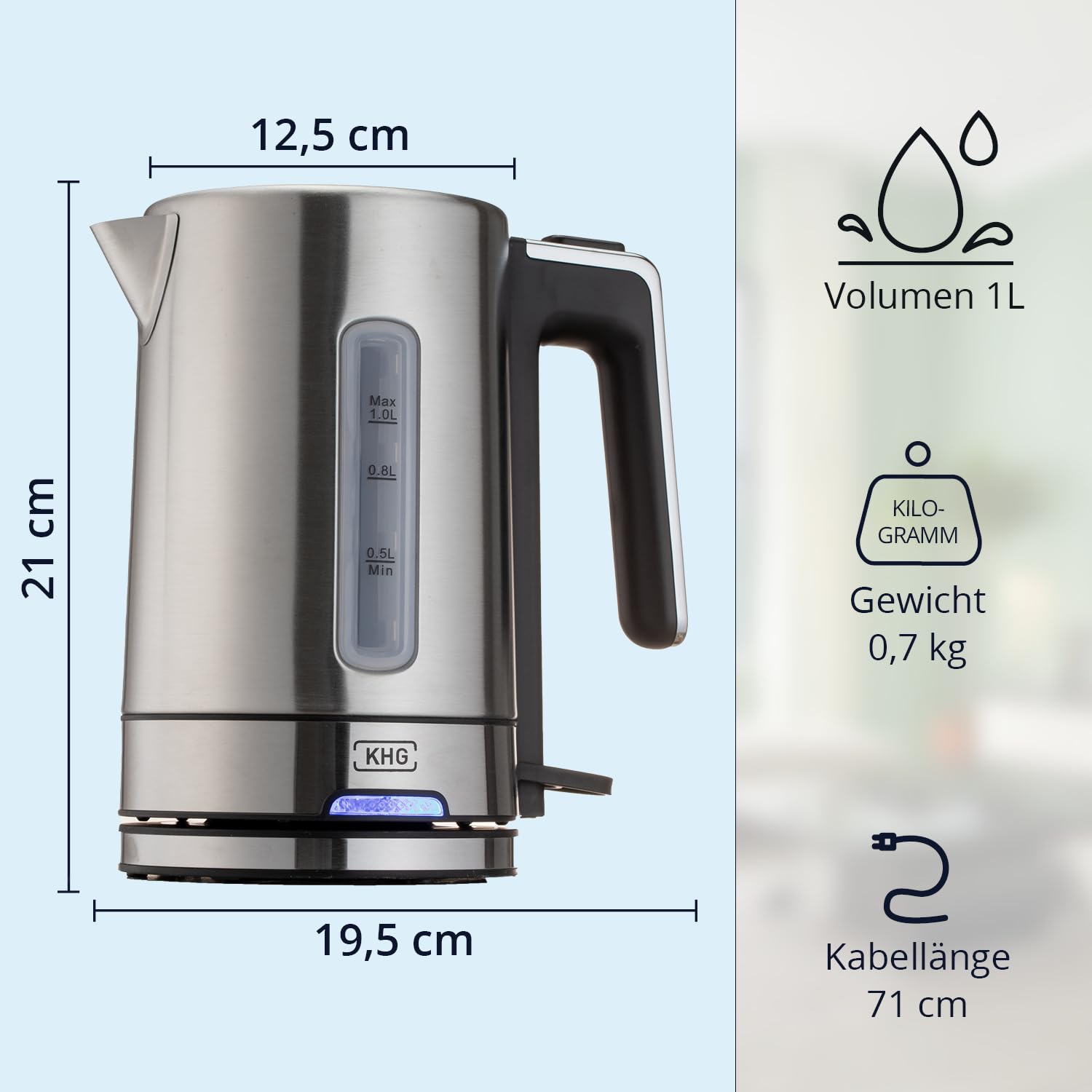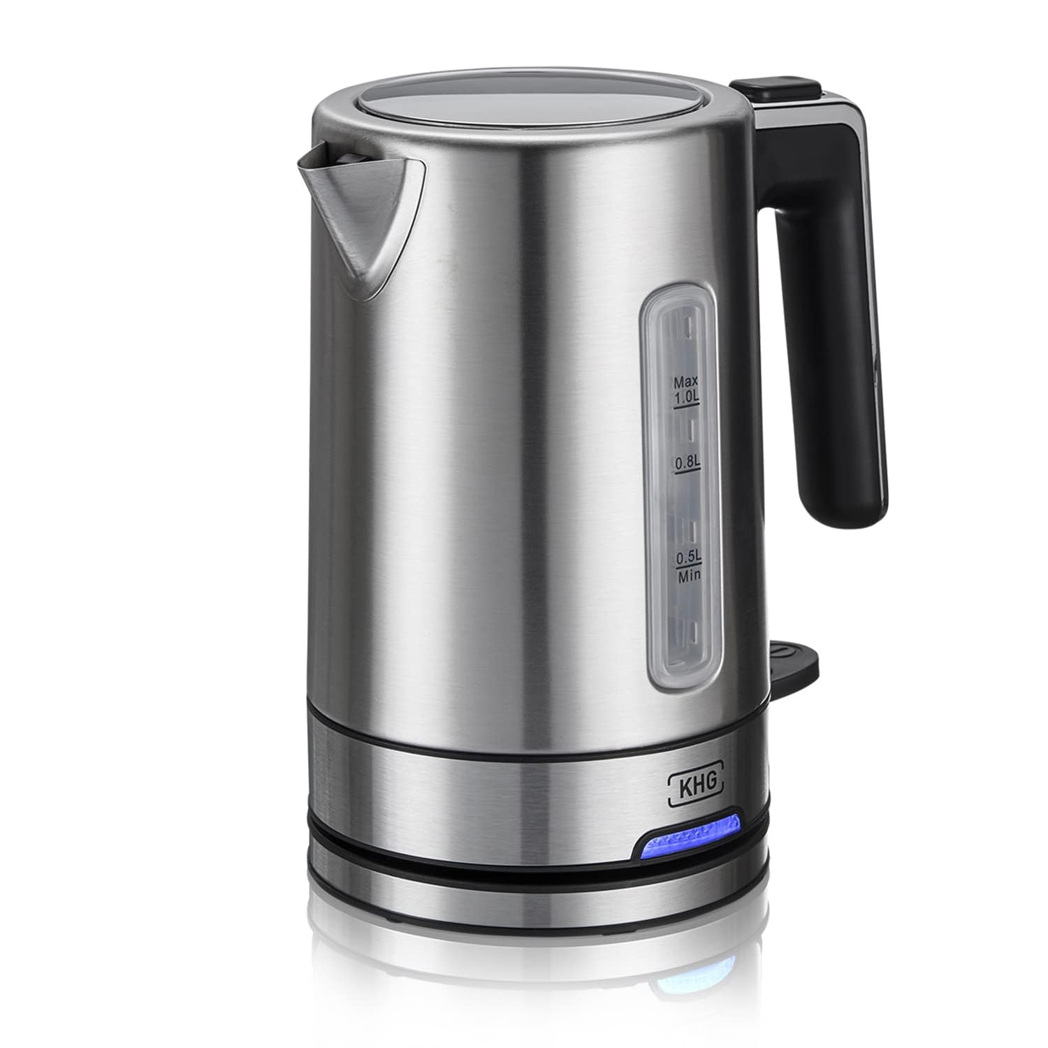 KHG Wasserkocher WK-105 ES Edelstahl, 1 Liter, abwaschbarer Kalkfilter, Wasserstandsanzeige, Öffnen per Knopfdruck, Trockengehschutz & Abschaltautomatik, verdecktes Heizelement, BPA-frei, 2200 Watt