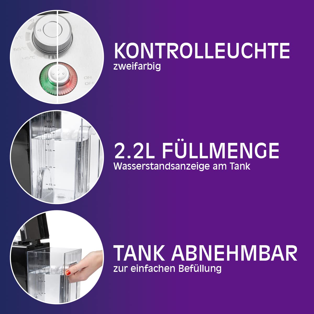 - Benutzerfreundliches Design: 2,2 Liter Fassungsvermögen, abnehmbarer Wassertank und Wasserstandsanzeige für einfache Handhabung und Kontrolle