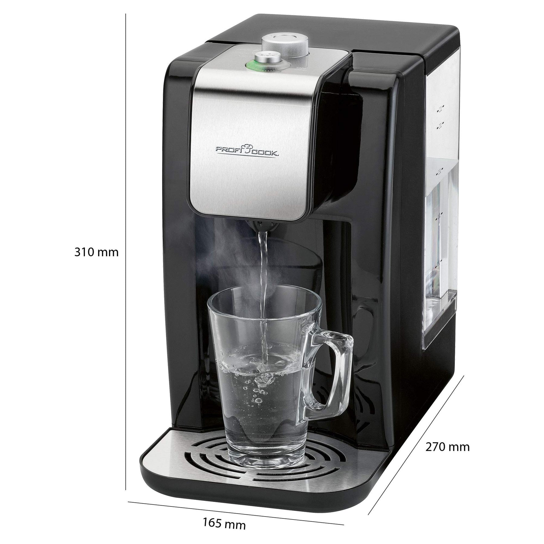 Einzelheiten: > Edelstahleinlage > High Speed-Wasserspender – heißes Wasser auf Knopfdruck > ECO-Save – 50 % Zeitersparnis gegenüber herkömmlichen Wasserkochern (energiesparend) > 100 °C in ca. 3 Sekunden > Variable Temperatureinstellung (von 45 °C bis 100 °C) > Bis zu 2,2 Liter Fassungsvermögen > Wassertank (abnehmbar) > Wasserstandsanzeige mit Skala > Frei wählbare Wassermenge > Ein-/Ausschalter > 2-farbige Kontrollleuchte > Sicherer Stand durch Saugfüße > 220–240 V, 50/60 Hz, 2200–2600 W