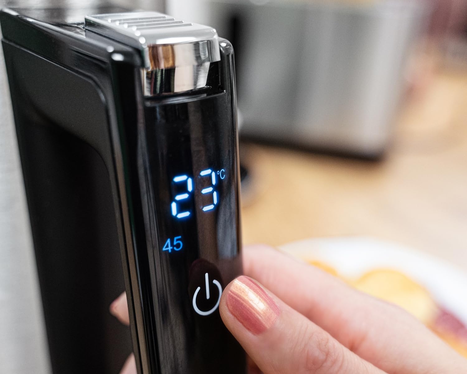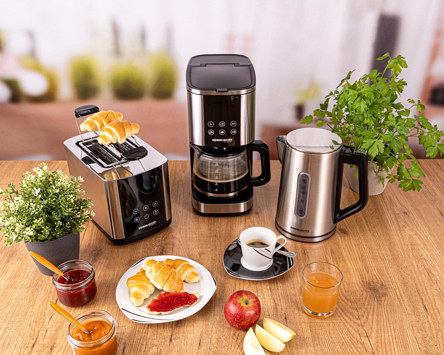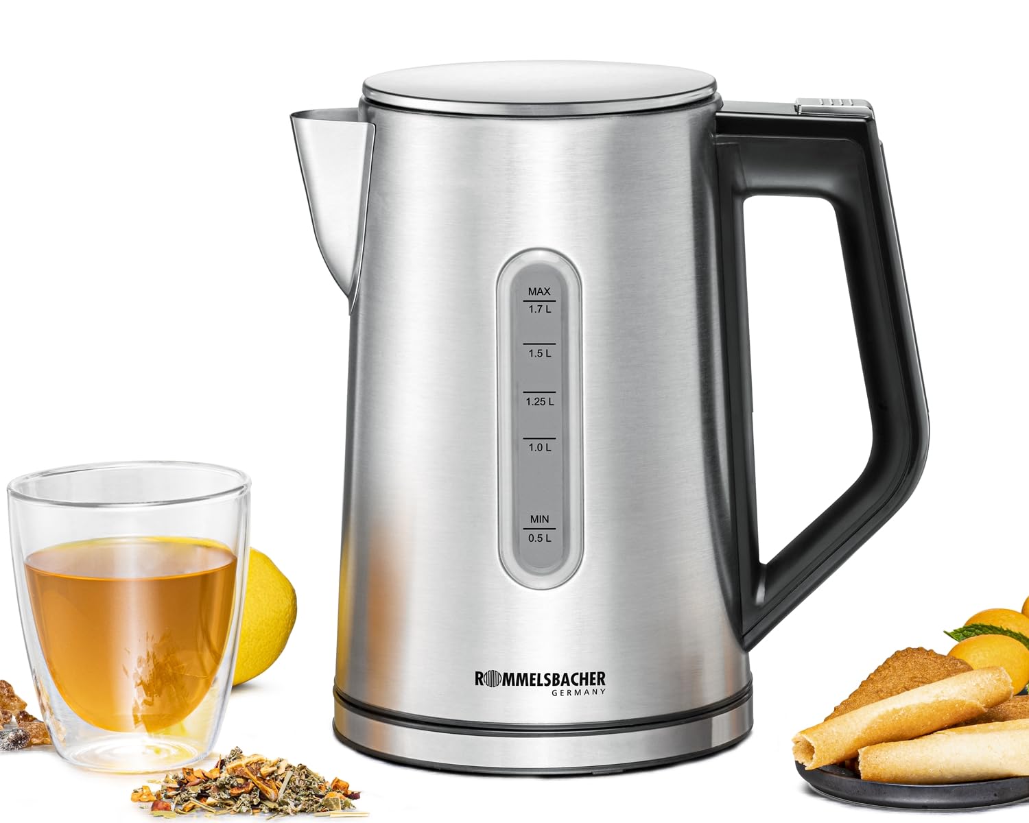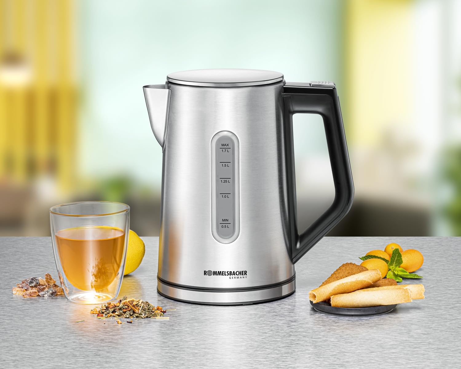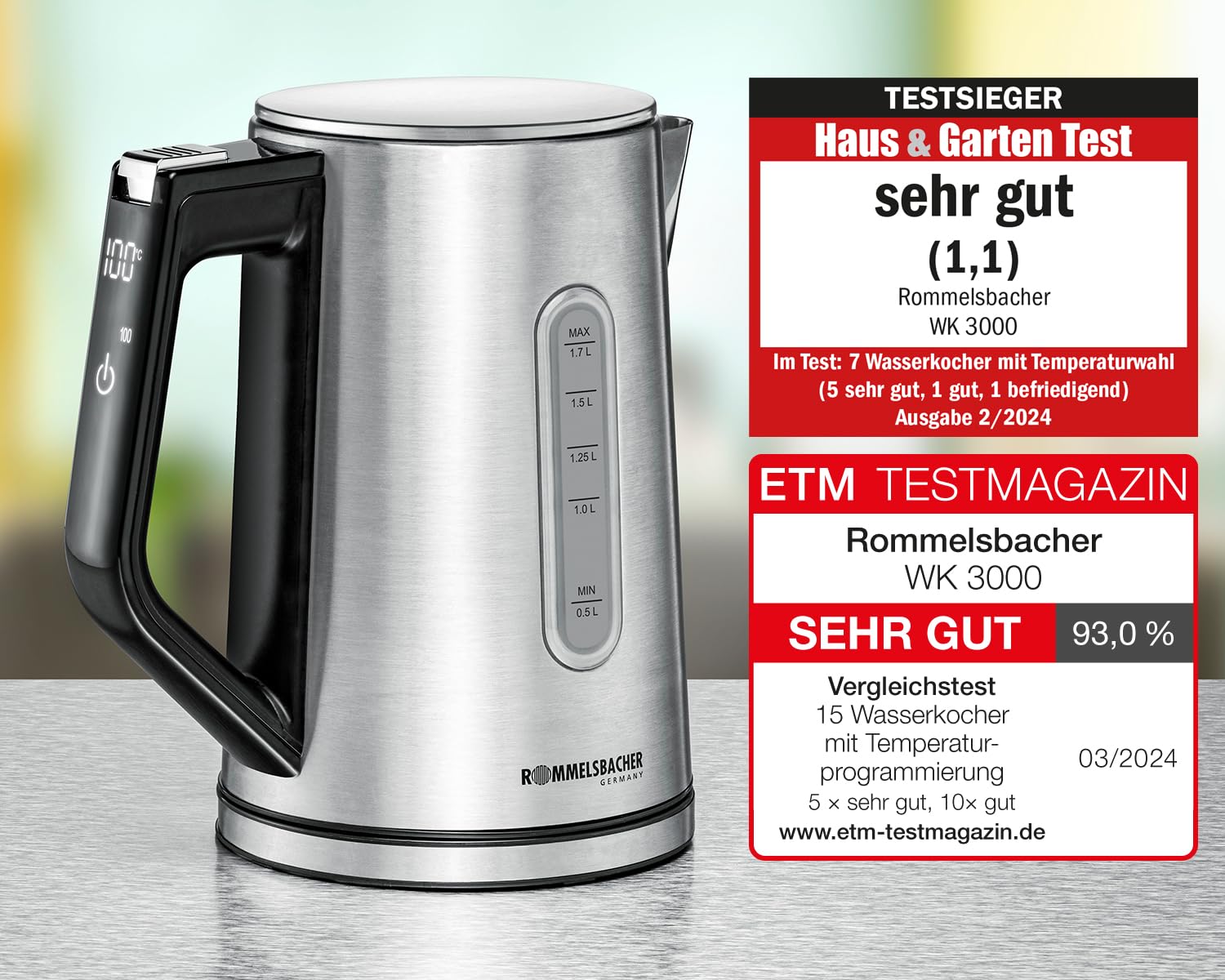 Einzelheiten: Der WK 3000 ist ein hochwertiger Wasserkocher aus der ROMMELSBACHER Sunny Frühstücksserie. Mit seinem zeitlos kompakten Design erfüllt er vielseitige Aufgaben in jeder Küche. Kochendes Wasser zum Brühen von Tee, Heißwasser für Instantgerichte oder warmes Wasser für Babynahrung – alles wird schnell und temperaturgenau erledigt. Dieses stilvolle Gerät überzeugt in Optik, Haptik und Funktionalität. Viel Power bis 3.000 Watt bringen das Wasser sekundenschnell auf Wunschtemperatur. Die beidseitigen Wasserstandsanzeigen bieten guten Überblick. Das äußerst nutzerfreundliche Bedienkonzept des Wasserkochers überzeugt im täglichen Gebrauch: Direkt am Griff befinden sich die 1-Tasten Steuerung sowie ein LED-Display. Sehr praktisch ist die Schnellstart-Funktion, die mit nur einem Tastendruck schnell kochendes Wasser liefert. Die Temperatur wird präzise elektronisch geregelt, eine automatische Warmhaltefunktion hält das Wasser auf dem gewünschten Level. Die große Einfüllöffnung, der herausnehmbare Edelstahlfilter und ein geschlossener Innenboden machen die Reinigung einfach. Sicherheit wird beim WK 3000 groß geschrieben; der wärmeisolierte Griff, die Kochstoppautomatik sowie ein Trockengehschutz geben ein gutes Gefühl bei der täglichen Nutzung. Dieser formschöne Wasserkocher aus dem Hause ROMMELSBACHER ist die perfekte Kombination aus Sicherheit, Funktionalität und Stil.