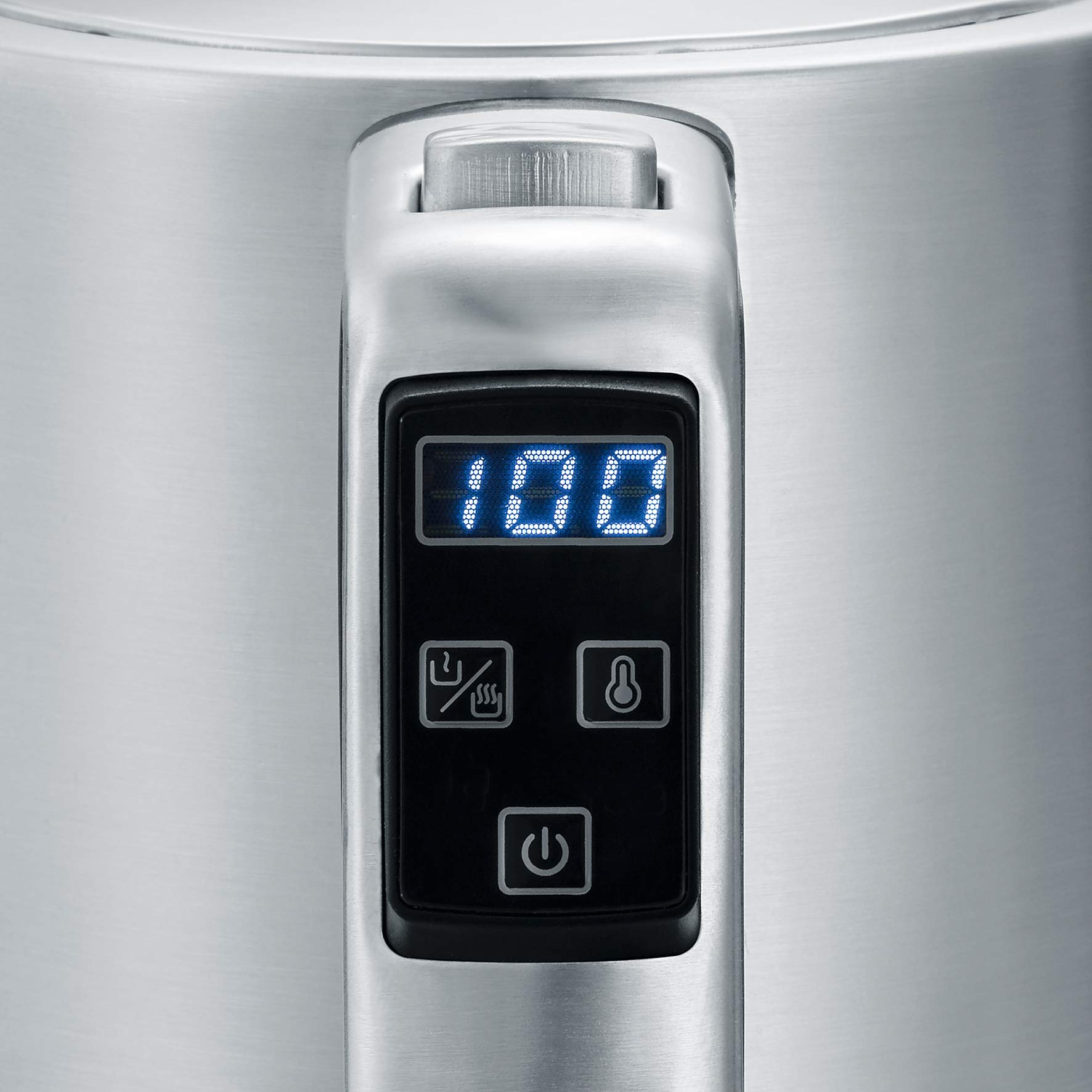 Einzelheiten: Für Freunde der Technik – Leistung: max. 3.000 W – Kapazität: ca. 1,7 l – Farbe: Edelstahl-gebürstet / schwarz – Edelstahlboden mit verdecktem Heizelement – beidseitige Wasserstandsanzeigen, beim Kochen blau, beim Warmhalten rot beleuchtet – Überhitzungs- und Trockenlaufschutz – Dampfstopp-Automatik für automatisches Abschalten bei kochendem Wasser – separate Warmhaltefunktion – Ausgusszotte mit Sieb – wärmeisolierender Kunststoffgriff – rutschfeste Gummifüße – Kabelaufwicklung