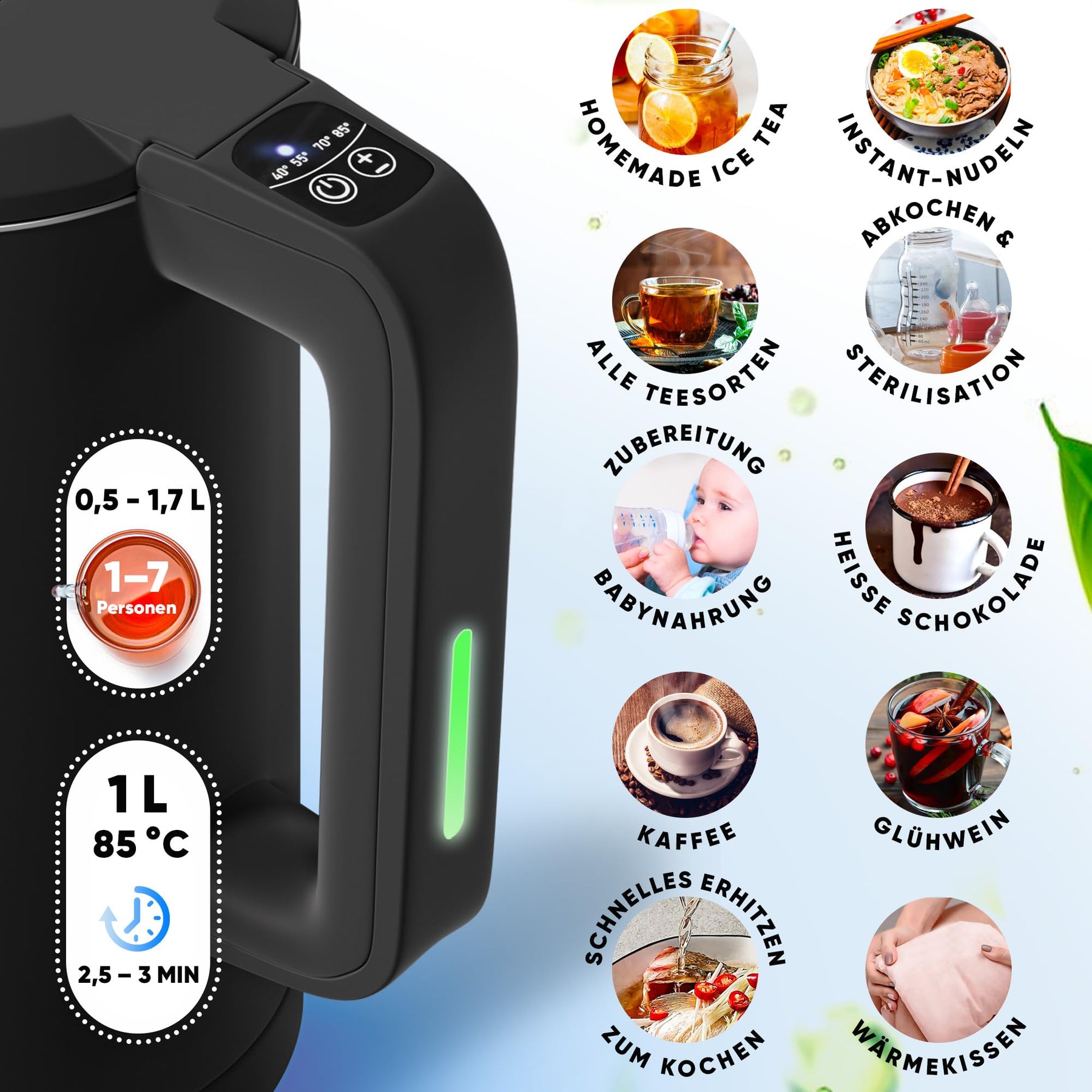 - PRÄZISE TEMPERATURKONTROLLE & VIELSEITIGKEIT: Die präzise Temperaturkontrolle ermöglicht es, die ideale Wassertemperatur einzustellen, wodurch der Wasserkocher vielseitig für die Zubereitung von Tee, Kaffee, und mehr wird.