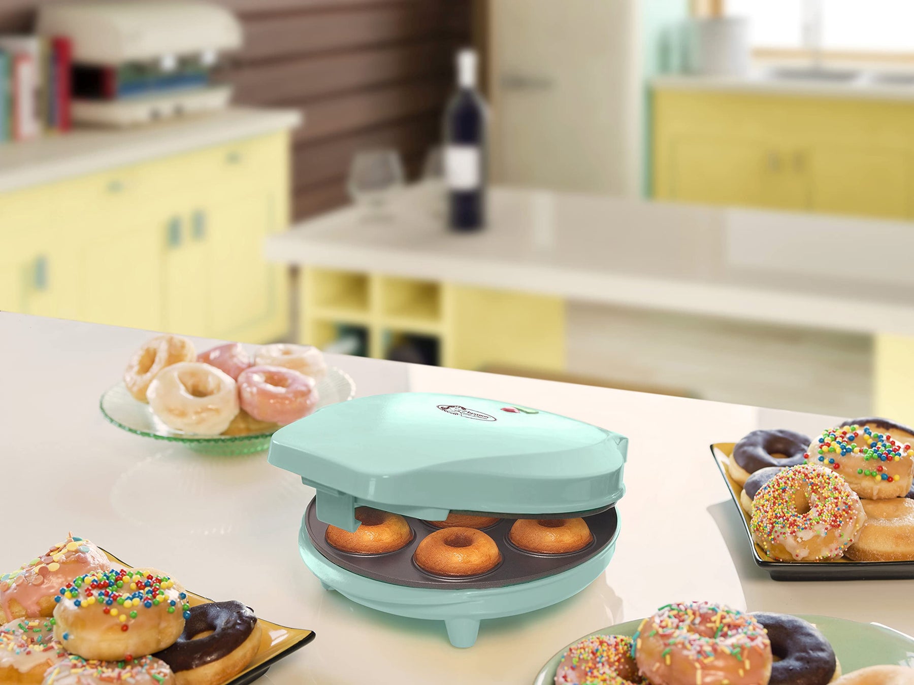 Einzelheiten: Dekorativer Donut Maker zum Backen von 7 süßen oder herzhaften Bagels und Donuts am Tisch – ideal für den gemeinsamen Brunch oder die Kaffeezeit. Automatische Temperaturregelung für die optimale Zubereitung von goldbraunen Donuts in den 7 Mulden (Ø 5 cm) ohne Papierförmchen. Antihaftbeschichtung zum leichten Entnehmen der Süßware und zur einfachen Reinigung des Gerätes, Platzsparende Kabelaufwicklung (Kabellänge: 74 cm). Sichere Nutzung auf dem Tisch dank Antirutschfüßen, hitzebeständigem Gehäuse, Deckel mit Verschlussclip, Bereitschaftsanzeige und Kontrollleuchte. Lieferumfang: 1 Bestron Donut Maker, Sweet Dreams, Leistung: 700 Watt, Gewicht: 1,26 kg, Material: Kunststoff/Metall, Maße: 25,7x20x9,3 cm, Farbe: Mint ADM218SDM