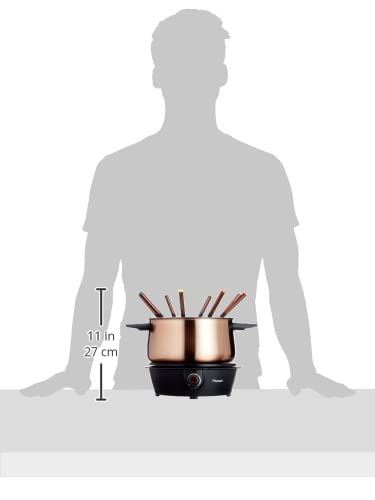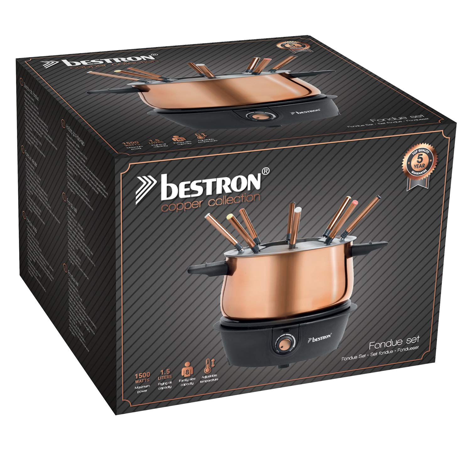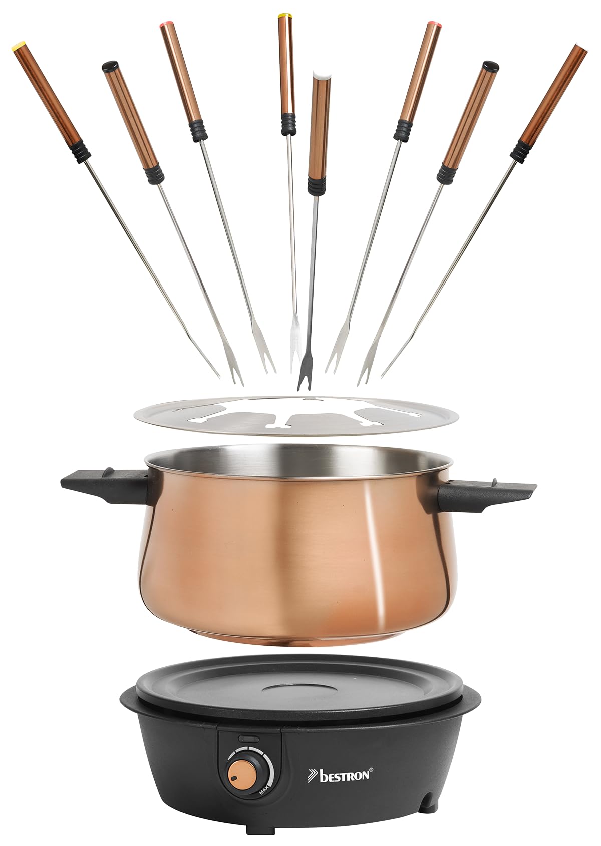 Bestron elektrische Fondue Set für bis zu 8 Personen, mit 8x Fonduegabeln & stufenlosen Thermostat, inkl. Spritzschutz, Farbe: Kupfer