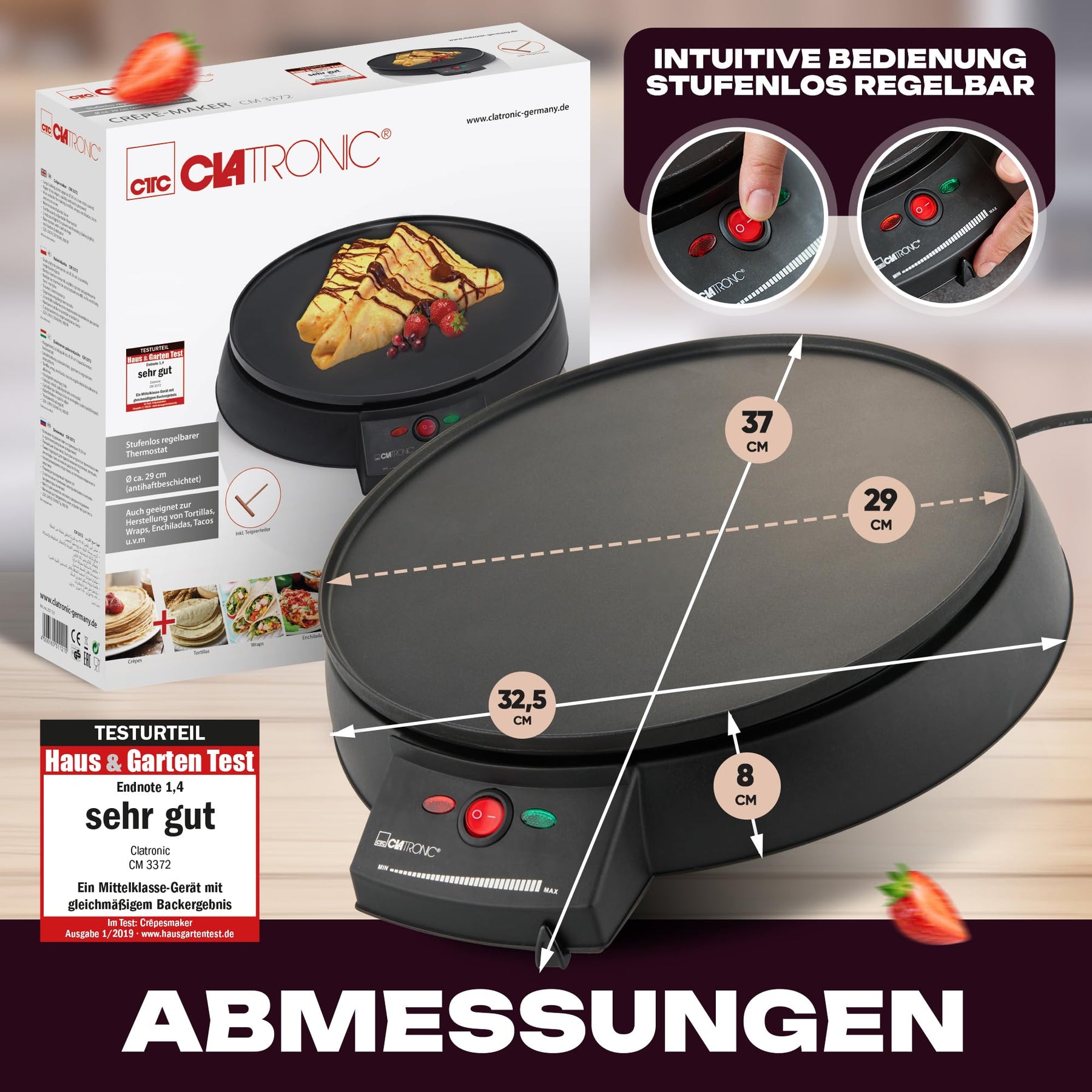 Clatronic Crepes Maker für Crepes mit Ø 29 cm | Crepe Maker inkl. Teigverteiler | antihaftbeschichter Oberfläche | Stufenlos regelbarer Thermostat u. Backampel | Pfannkuchen Maker mit 900 W | CM 3372