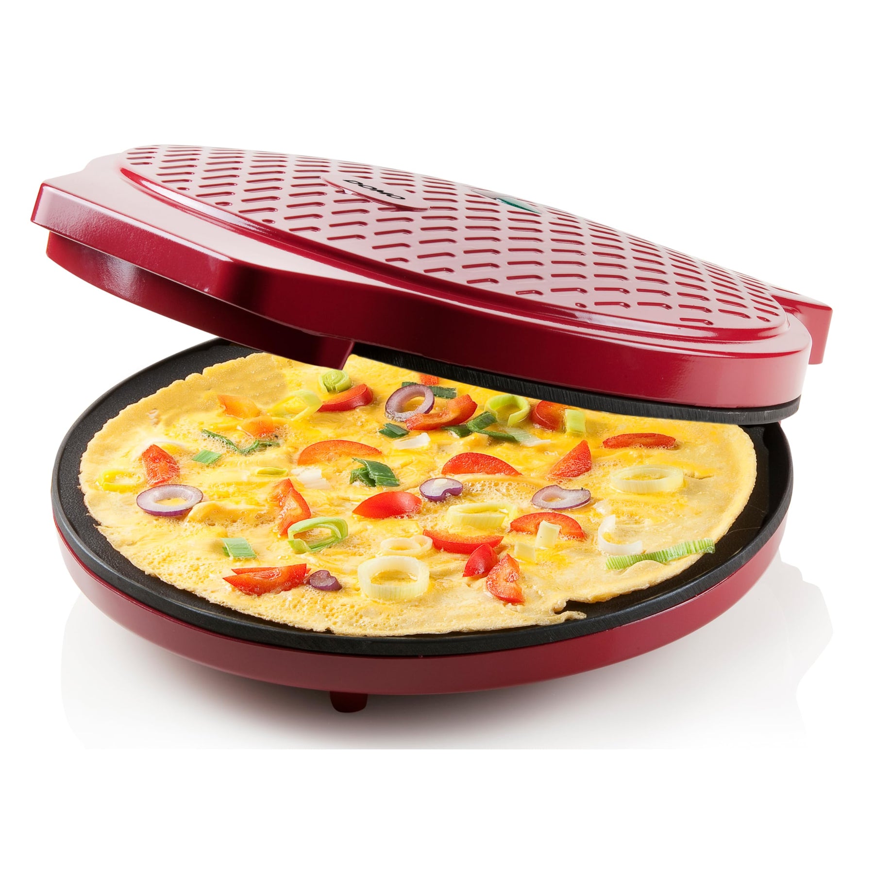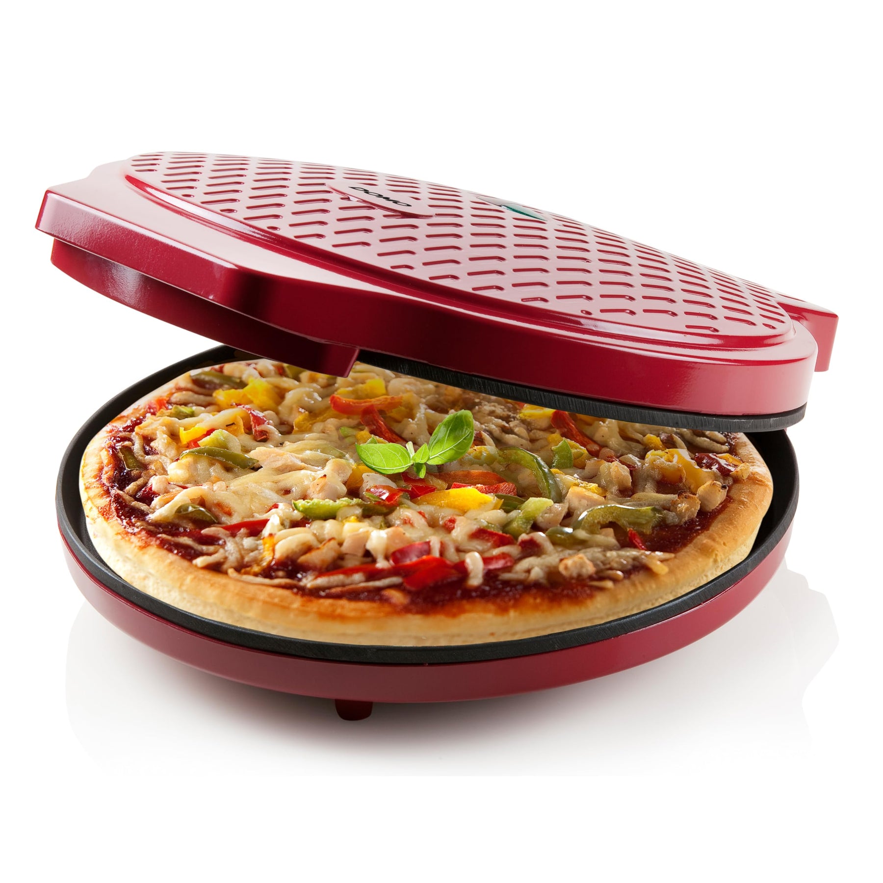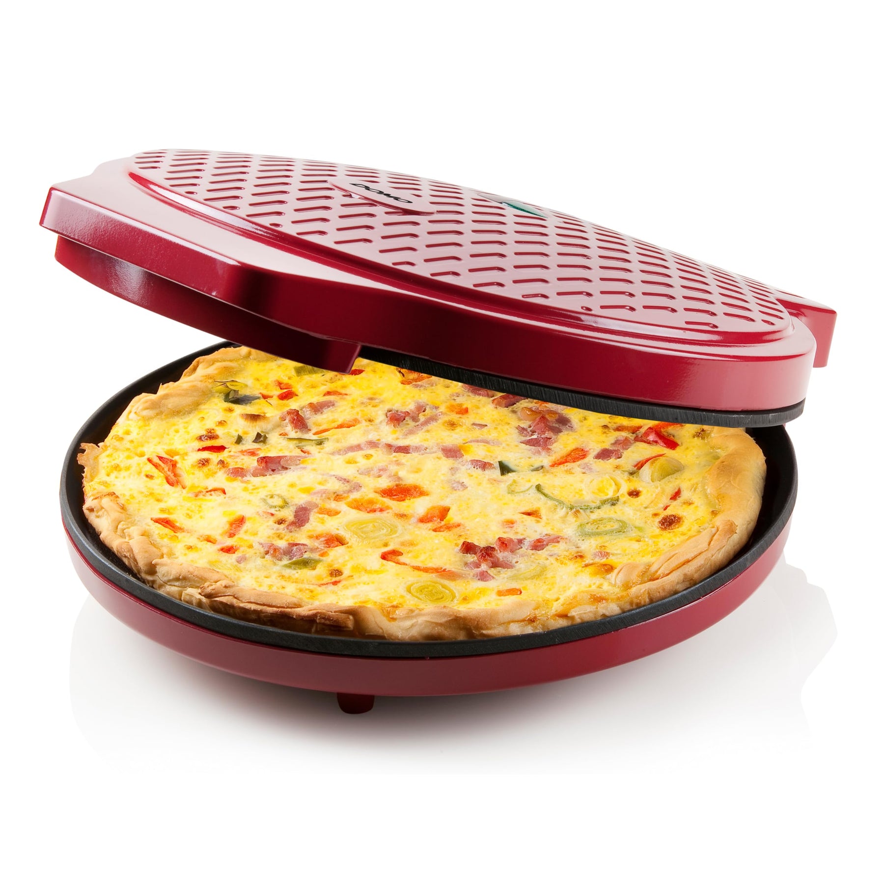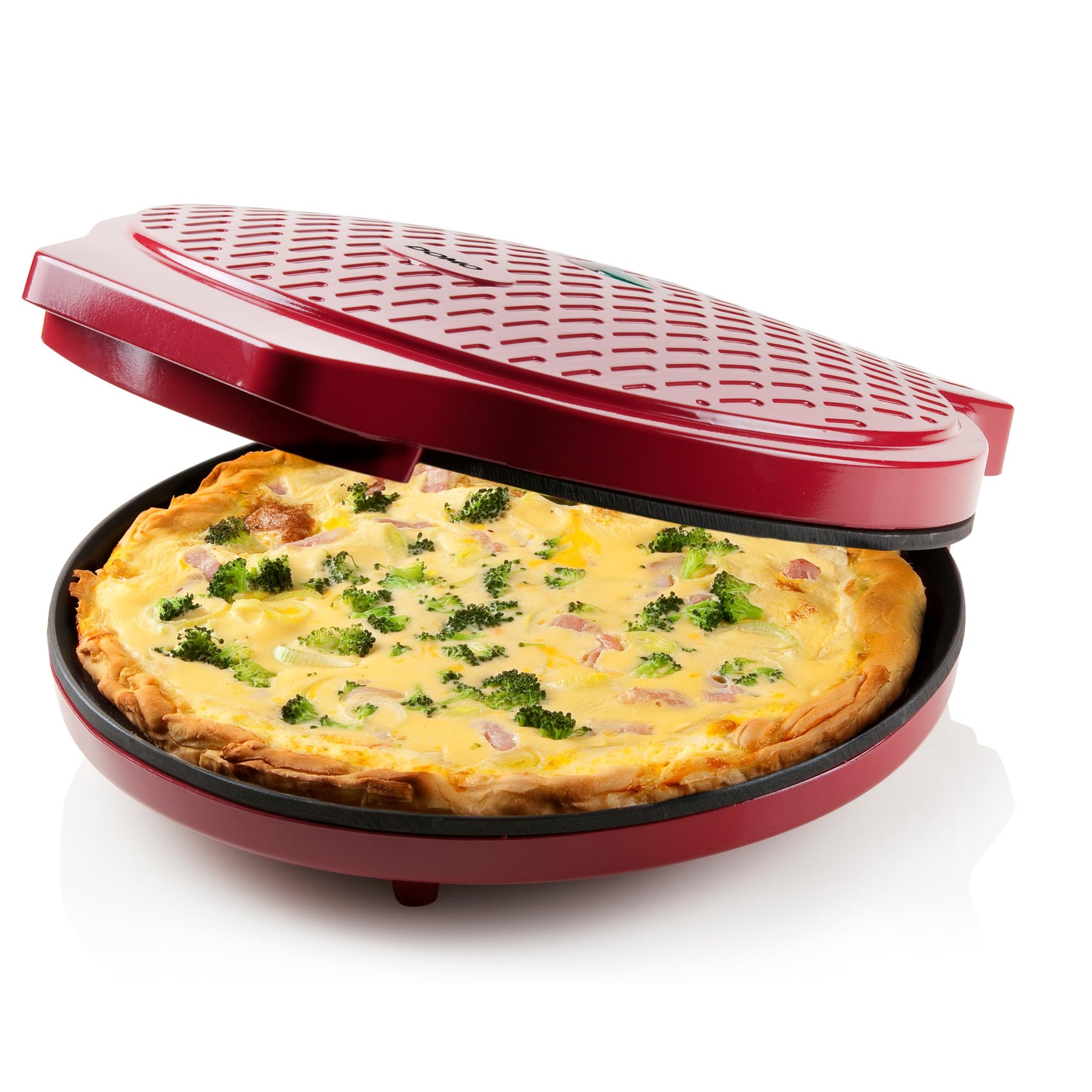 Mit dem Express Pizzamaker schaffen Sie sich perfekte Möglichkeiten für die schnelle Zubereitung von Pizza, Omelette, Quiche, Pfannkuchen, Cookie, Tortillas... Dank dem 30 cm großen Durchmesser der Backplatte passen auch Tiefkühlpizzen optimal in die Backplatten. Lassen Sie Ihren Ideen freien Lauf und genießen Sie Ihre Pizza mit saftigem Schinken, frischen Tomaten, Zwiebeln oder Champignons und herzhaften Käse. Mit diesem Pizzamaker, oder eigentlich ist es ein universeller Zubereiter für alle leckeren Gerichte die in einer Pfanne mit Ober- und Unterhitze zubereitet werden können, bleiben keine Wünsche offen. Gönnen Sie sich auch morgens ein frisches Omlette oder leckere Pfannkuchen zum Frühstück. Ein Rezeptheft mit vielen Ideen ist im Lieferumfang enthalten. Vielseitig und zeitsparend und somit ideal für Familien, Single-Küchen oder WGs.