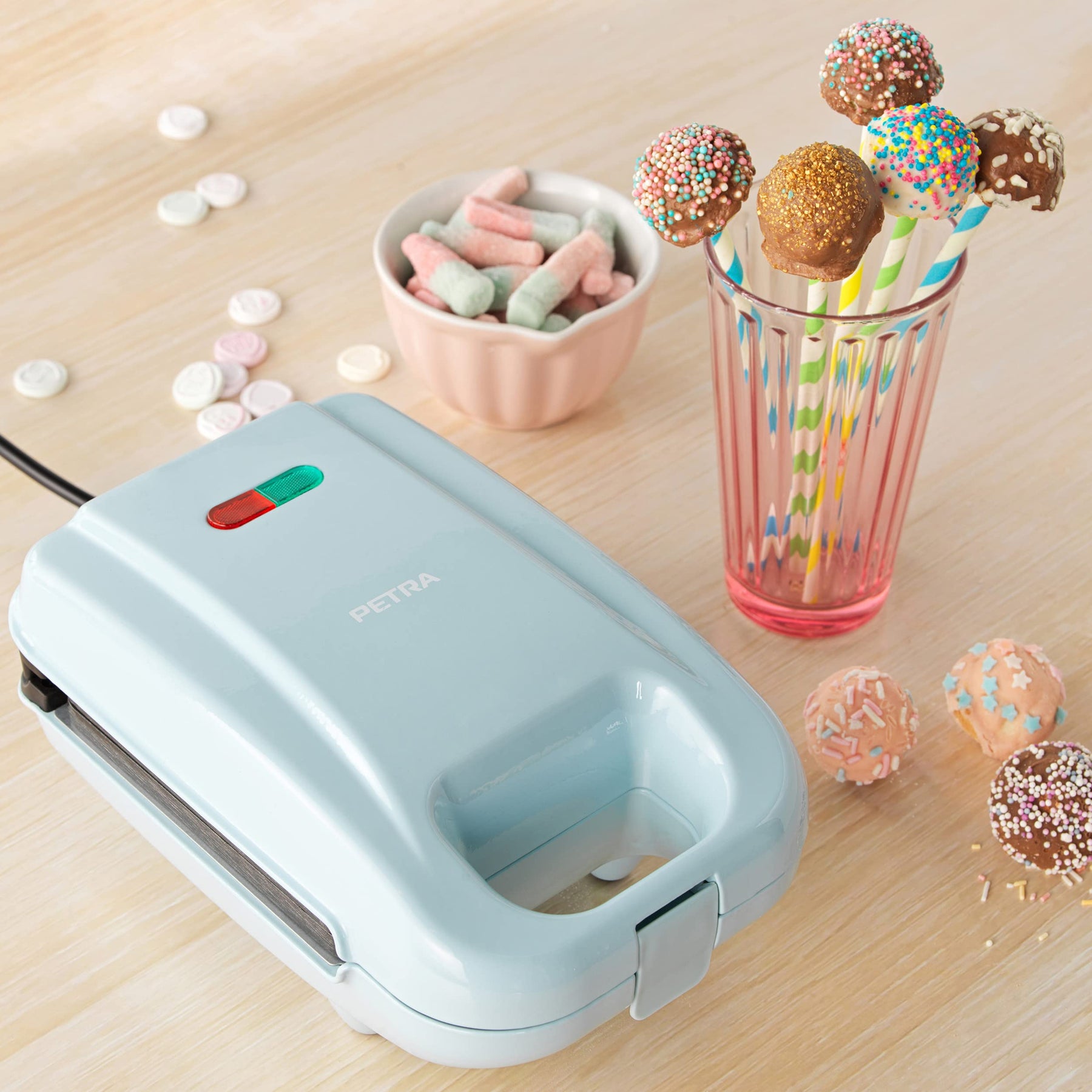 Einzelheiten: Bringen Sie einen Hauch von Pastell in Ihre Küche und backen Sie bis zu 16 Cake Pops, eine leckere große Waffel und 4 Donuts, dank des fabelhaften, kompakten 3-in-1-Mini-Treat-Makers von Petra. Perfekt für Familienfeste, Partys und Buffets verfügt dieses 650-W-Gerät über 3 herausnehmbare Kochplatten und hat eine Aufheizzeit von nur 3 Minuten, sodass Sie in Sekundenschnelle leckere Gebäcke genießen können. Die rutschfesten Füße bieten Sicherheit und dank der Antihaftbeschichtung bleibt das Gebäck nicht am Gerät haften, sodass die Reinigung ganz einfach ist.