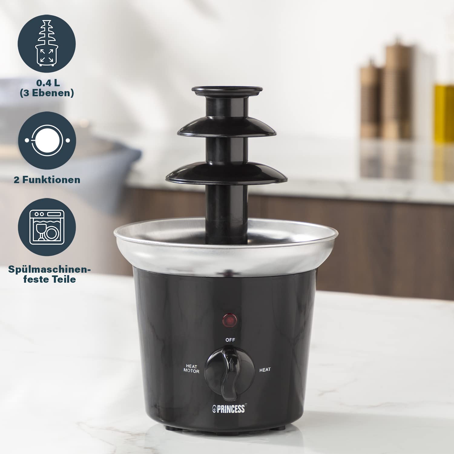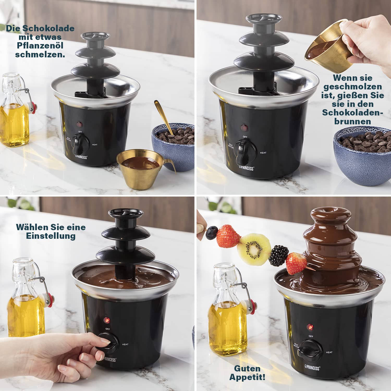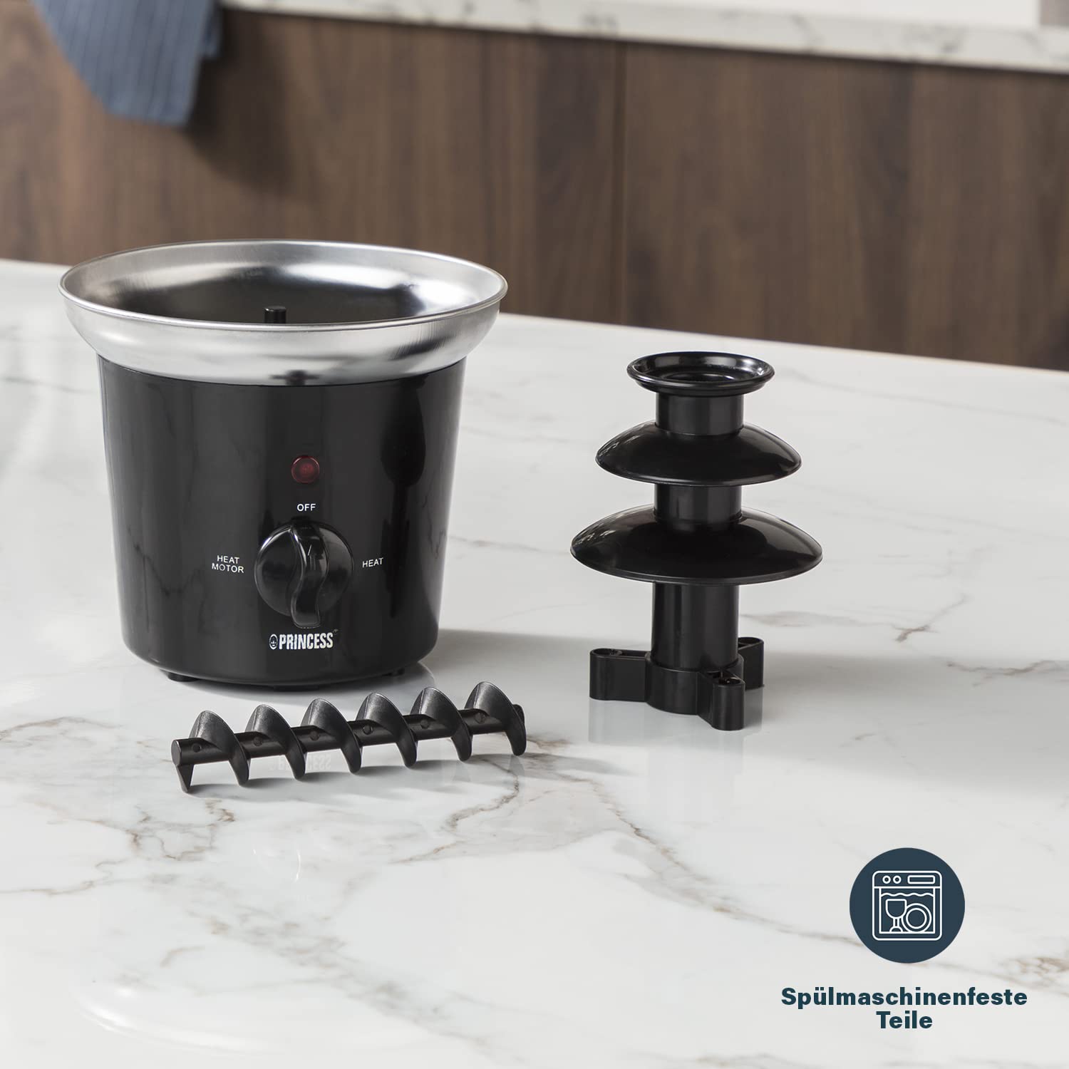 Einzelheiten: Der Princess 292994 Schoko-Brunnen ist das ideale Gerät für alle Schokoladenliebhaber. Überraschen Sie Ihre Kinder bei der Geburtstagsparty, verwöhnen Sie Ihren Partner am Valentinstag oder verpassen Sie Ihrer Dinner Party den richtigen WOW-Effekt. Der Brunnen hält die vorab geschmolzene Schokolade warm und pumpt die Schokolade nach oben, wo sie dann über drei Ebenen wieder nach unten fließt. Tunken Sie ganz nach Belieben Früchte, Kekse, Waffeln oder auch Salzstangen in den süßen Schokoladenstrom.
