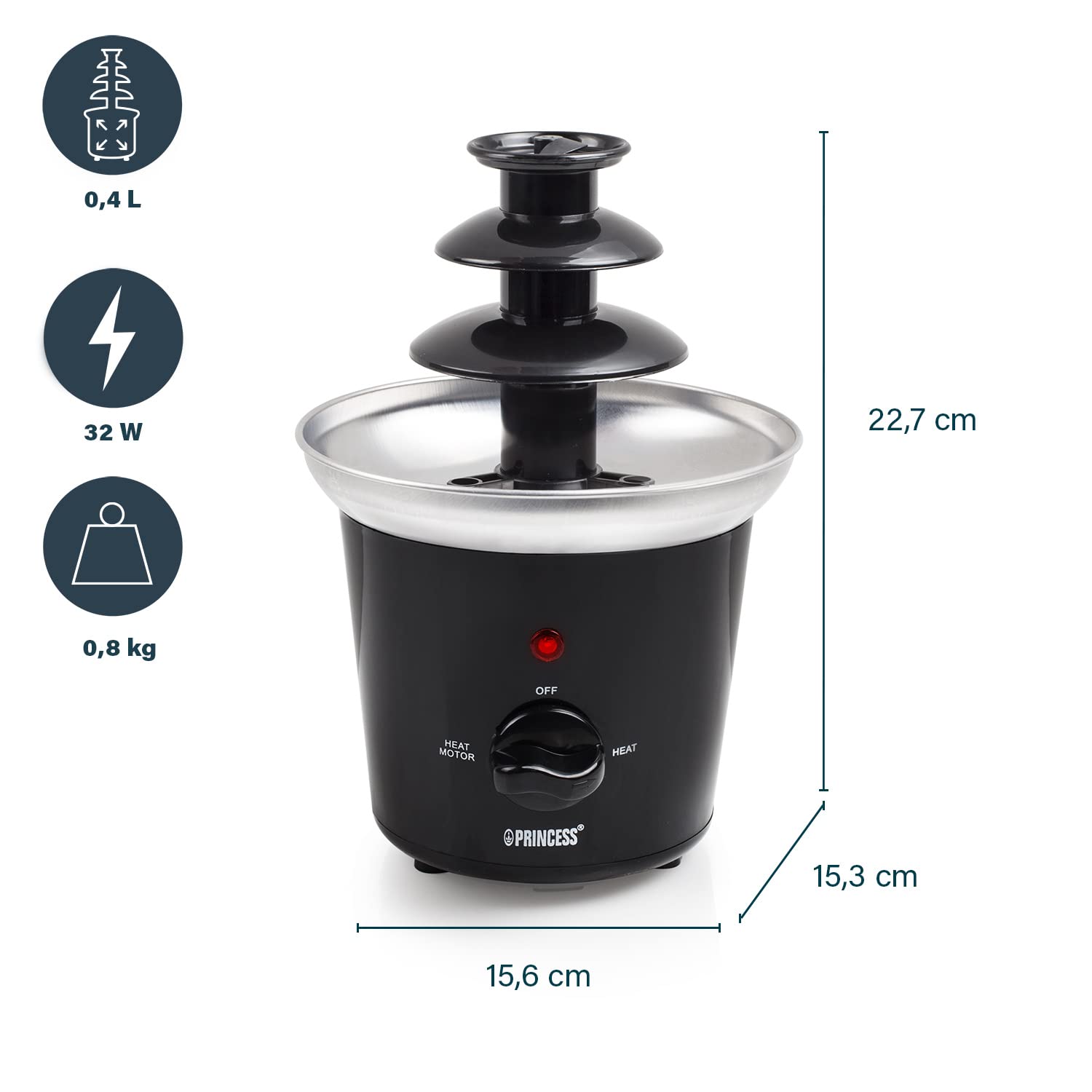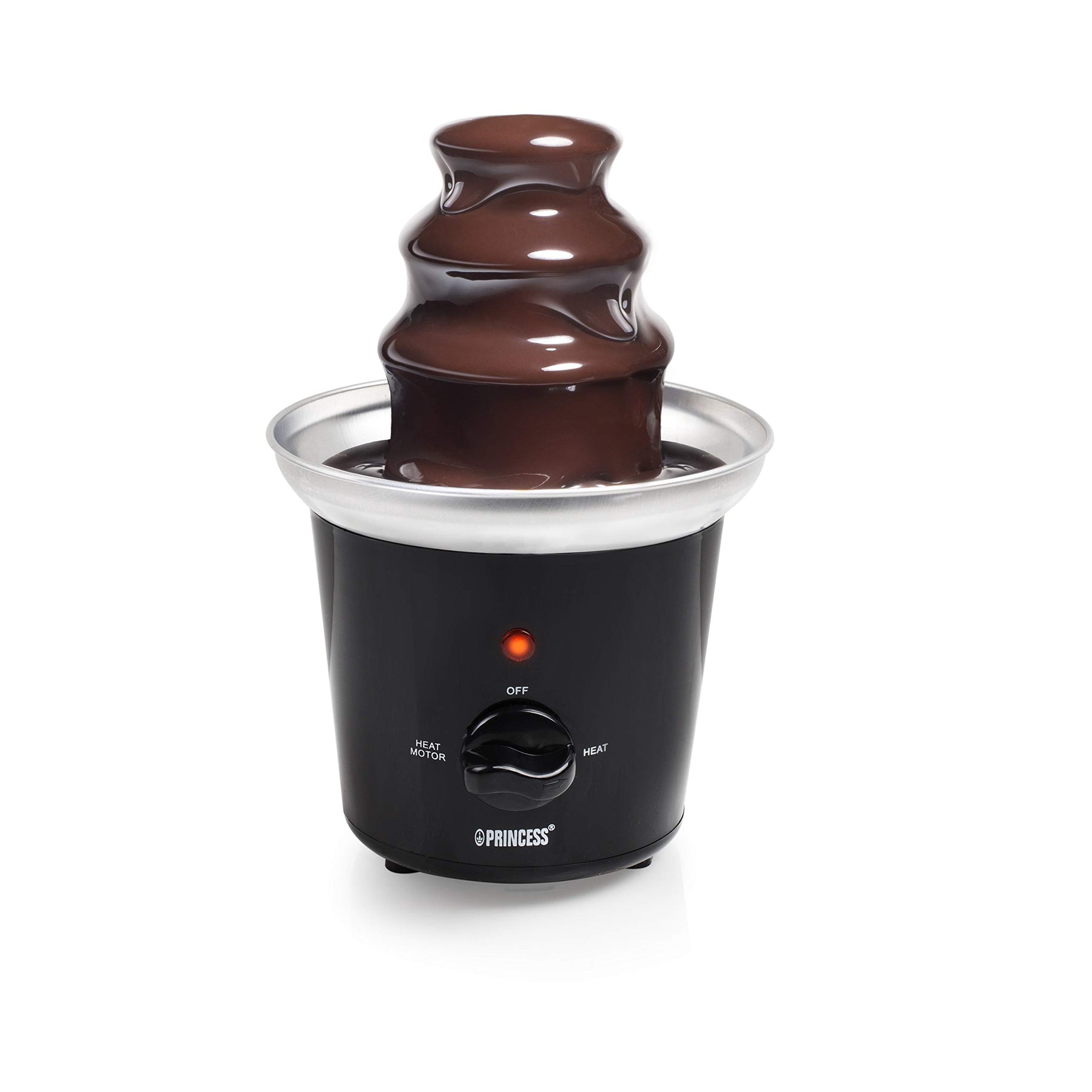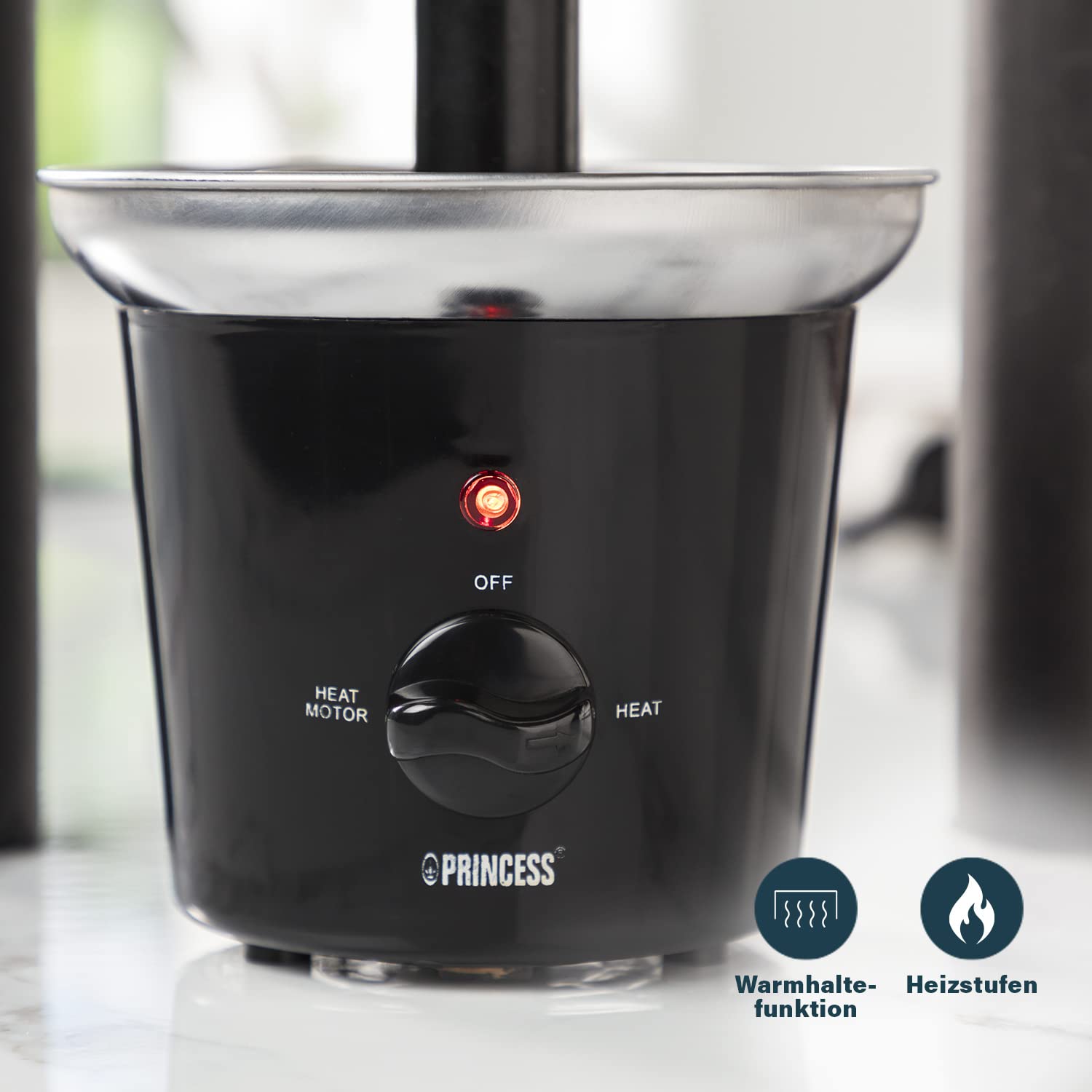 Einzelheiten: Der Princess 292994 Schoko-Brunnen ist das ideale Gerät für alle Schokoladenliebhaber. Überraschen Sie Ihre Kinder bei der Geburtstagsparty, verwöhnen Sie Ihren Partner am Valentinstag oder verpassen Sie Ihrer Dinner Party den richtigen WOW-Effekt. Der Brunnen hält die vorab geschmolzene Schokolade warm und pumpt die Schokolade nach oben, wo sie dann über drei Ebenen wieder nach unten fließt. Tunken Sie ganz nach Belieben Früchte, Kekse, Waffeln oder auch Salzstangen in den süßen Schokoladenstrom.