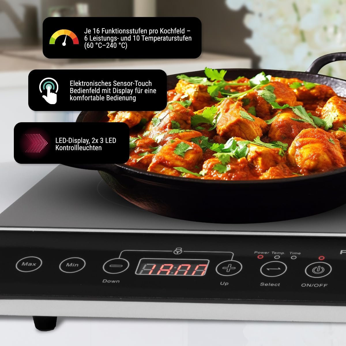 • Eine sorgenfreie Nutzung bietet die Induktionskochplatte dank der elektronischen Sensor-Touch Bedienung mit LED-Display, dem 180-Minuten-Timer mit Abschaltautomatik und Endsignal, sowie dem Überhitzungsschutz