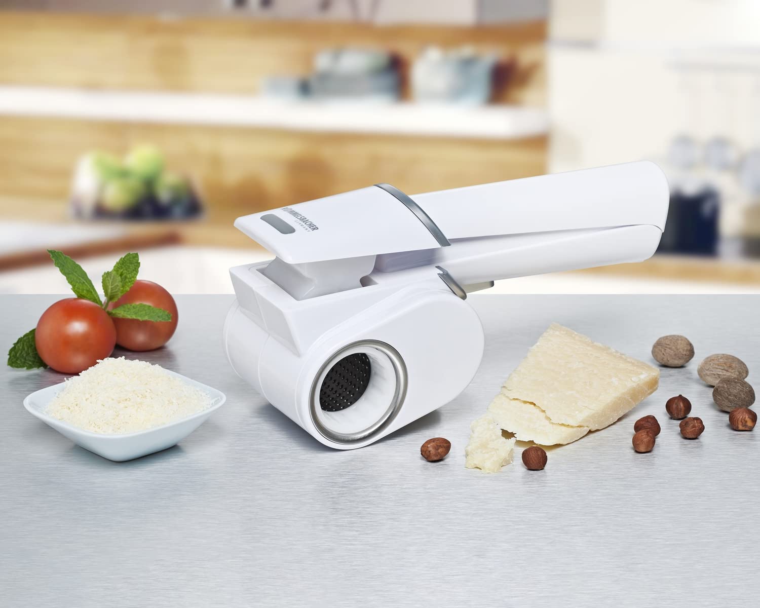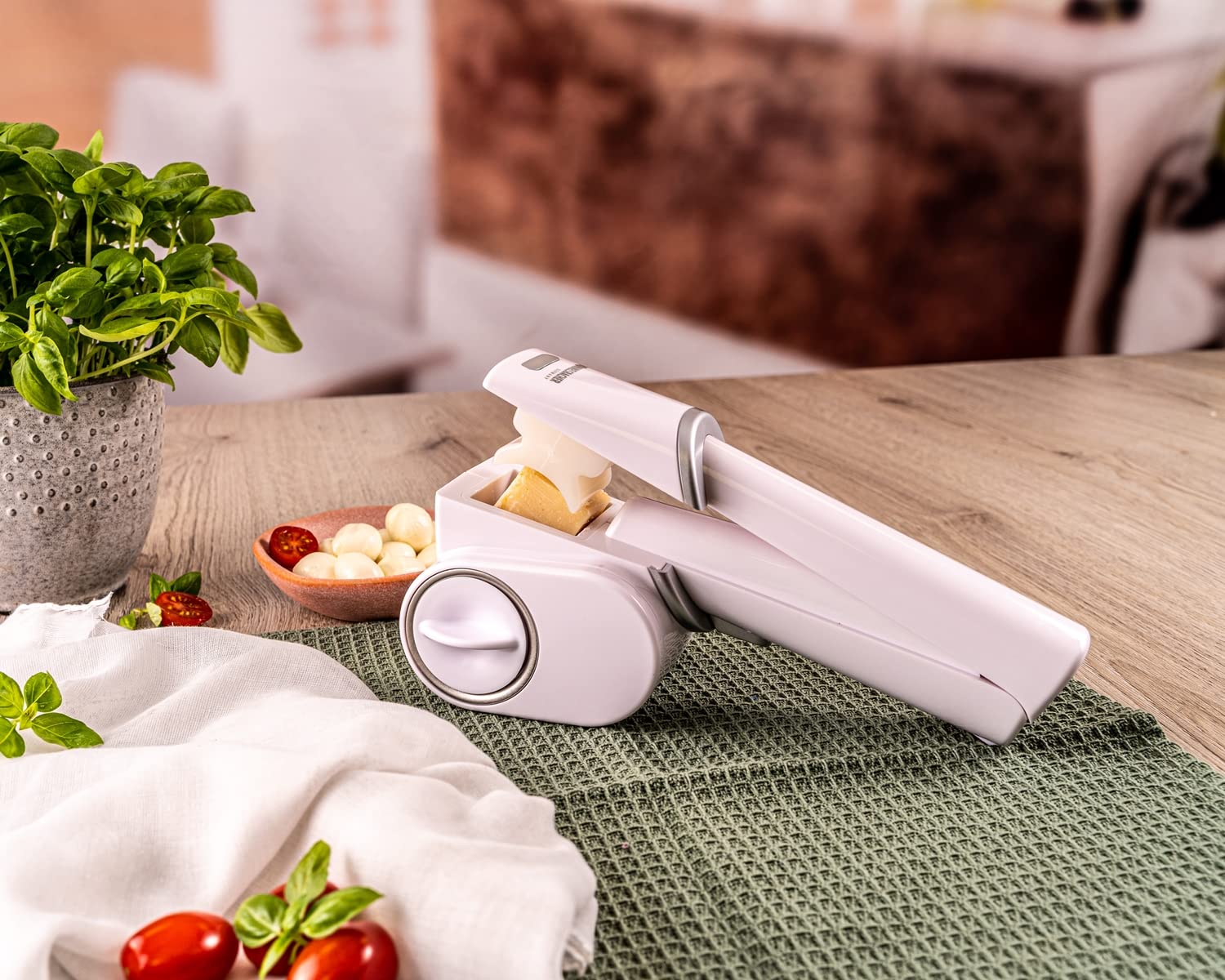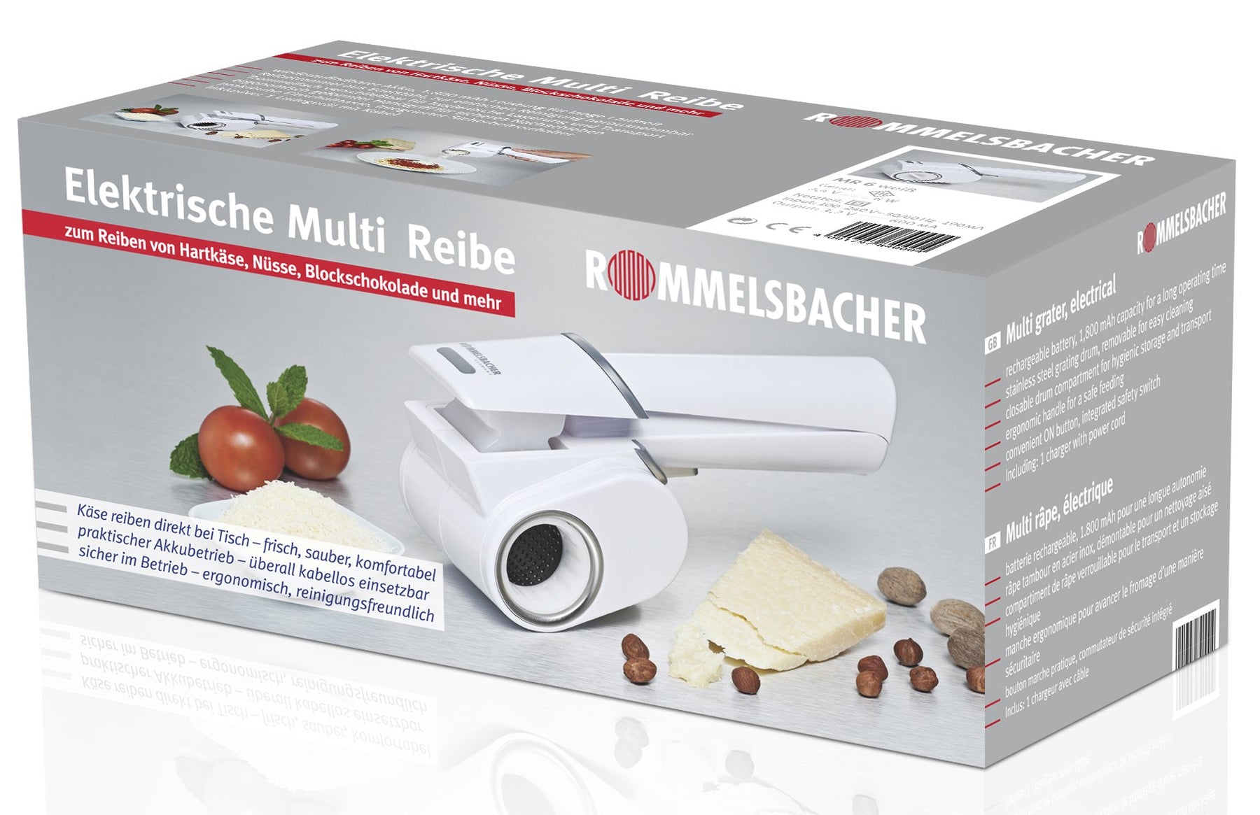 Mit der praktischen Multi Reibe von Rommelsbacher lassen sich feste Käsesorten wie Parmesan oder Grana Padano komfortabel und sicher reiben. Auch Blockschokolade, Nüsse und getrocknetes Brot lassen sich damit perfekt raspeln. Der praktische Akkubetrieb erleichtert die Arbeit, da die Reibe flexibel und unabhängig von der Steckdose zu benutzen ist. Zudem ist das Gerät so schick, dass man es gerne mit an den Tisch nimmt, um z. B. Hartkäse ganz frisch direkt auf den Pasta-Teller zu reiben. Damit nach dem Reiben keine Reste aus der Trommel fallen, kann diese mit einem Deckel hygienisch verschlossen werden. Die Bedienung selbst ist denkbar einfach. Mit nur einer Hand drückt man den Griff zusammen und presst dabei das Lebensmittel auf die Reibe. Zugleich aktiviert man auf der Unterseite die Einschalttaste; ein Sicherheitsschalter sorgt dabei für Sicherheit. Und am Ende lässt sich die Edelstahl Reibetrommel zur einfachen Reinigung entnehmen. Mit diesem Gerät wird Reiben zum Vergnügen und Kochen ein ganzes Stück komfortabler!
