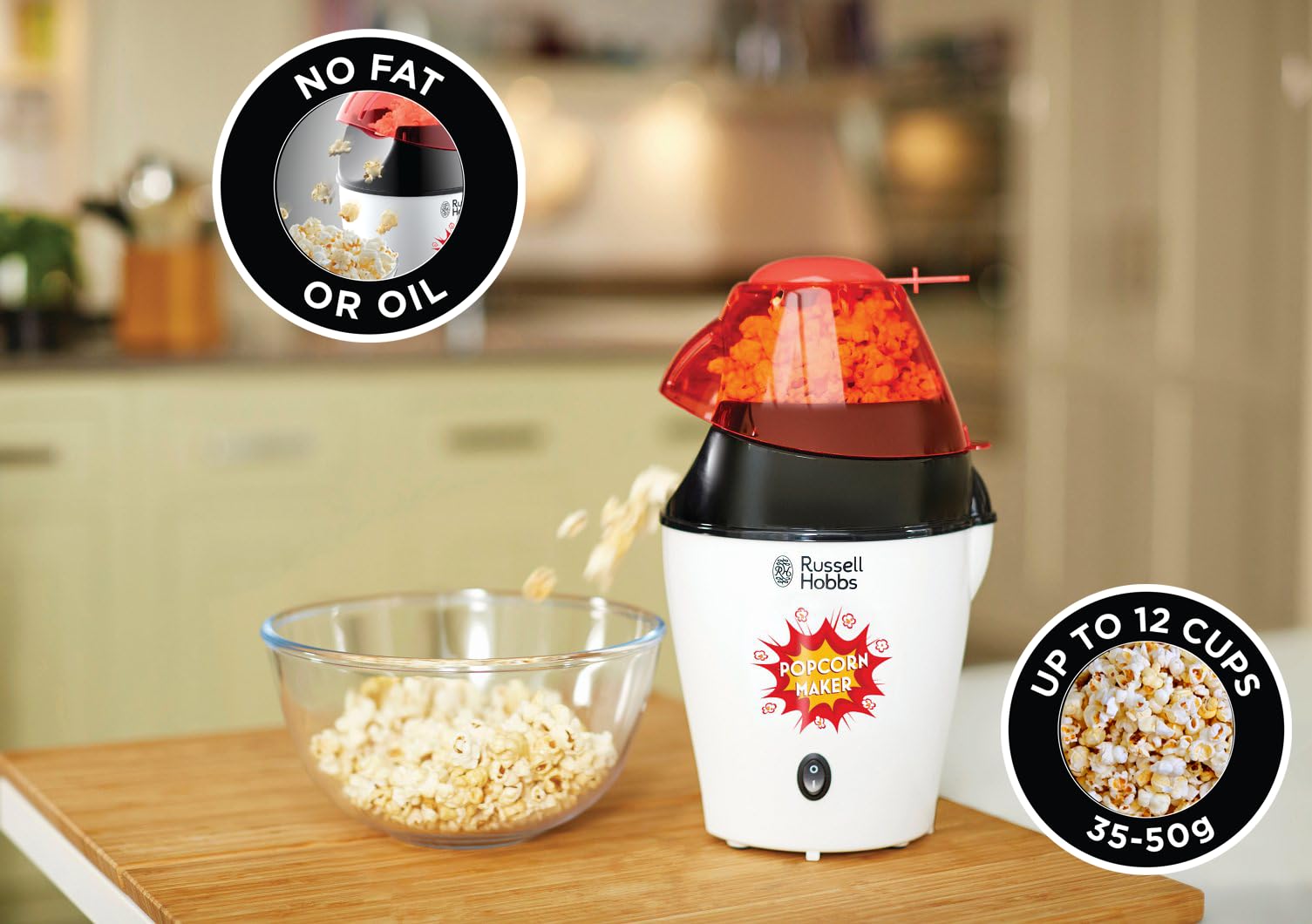 - Kinofeeling für Zuhause:Mit dem 1290 Watt starken Popcorn Maker von Russell Hobbs ist Popcorn selber machen ein Kinderspiel - in weniger als 3 Minuten lässt sich der kalorienarme Snack zubereiten!