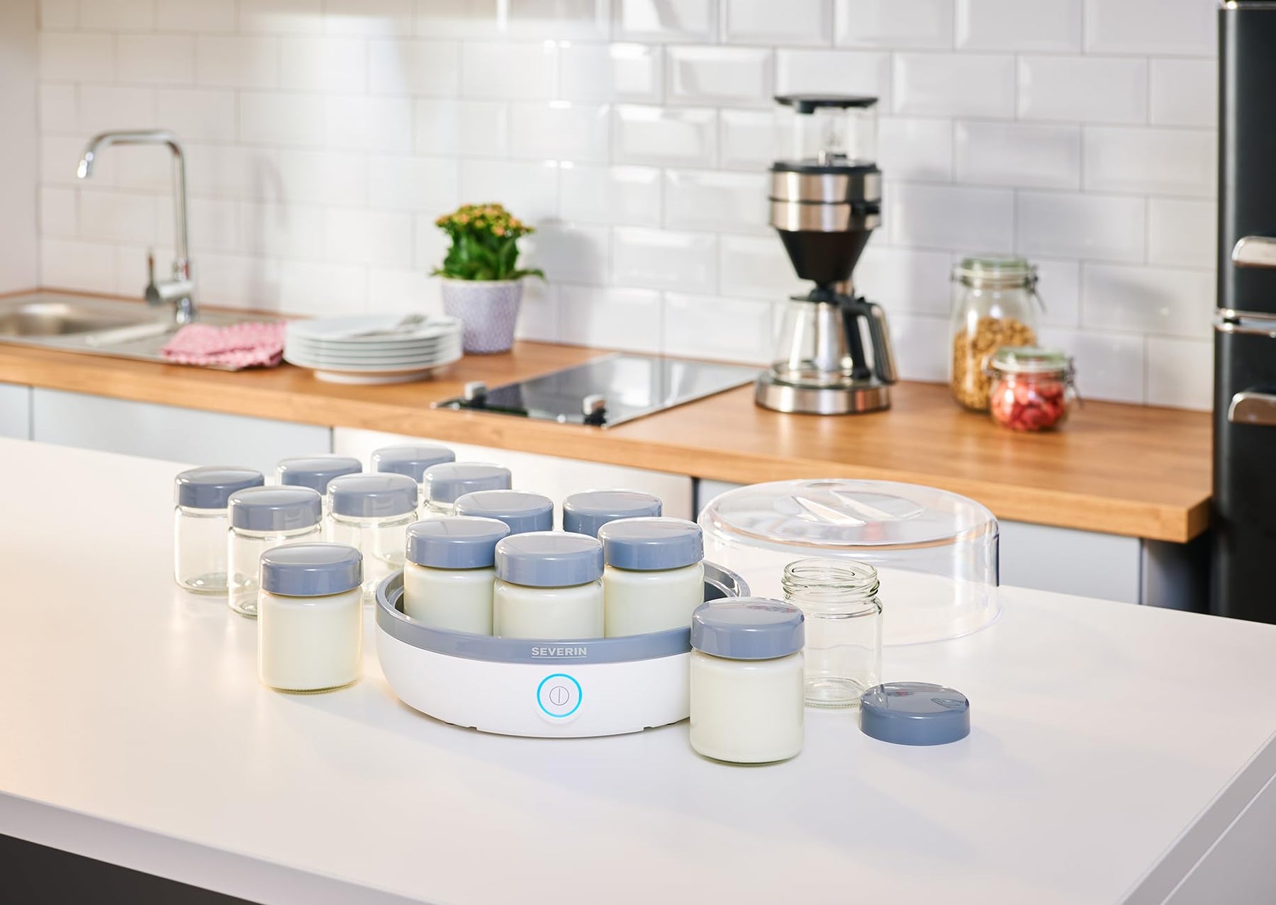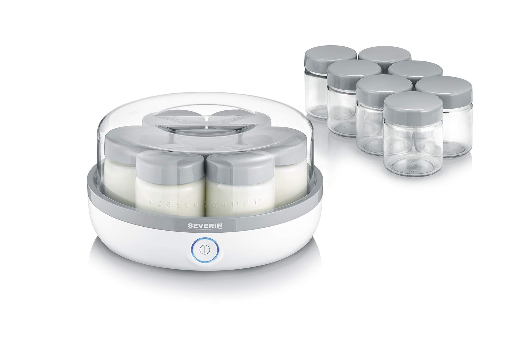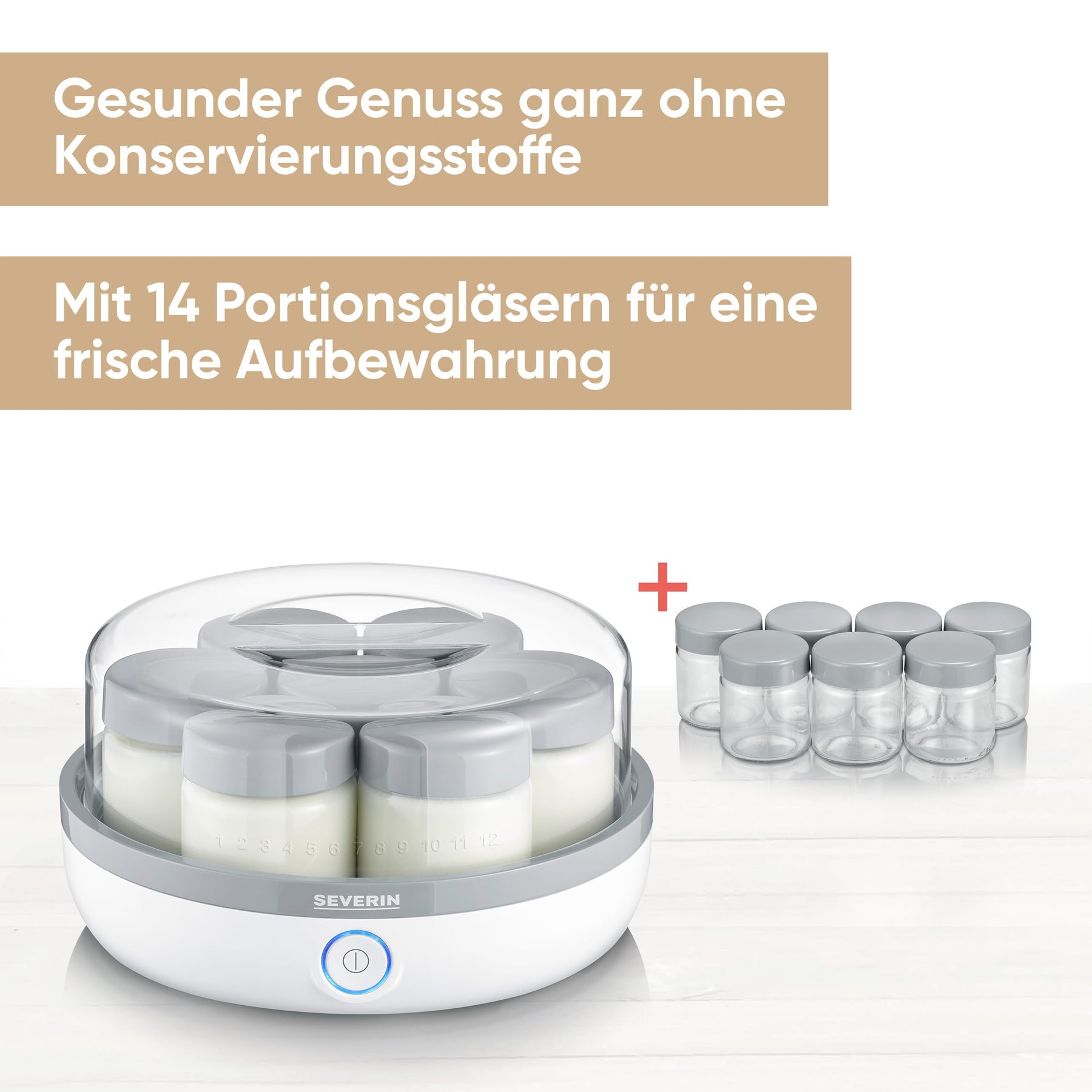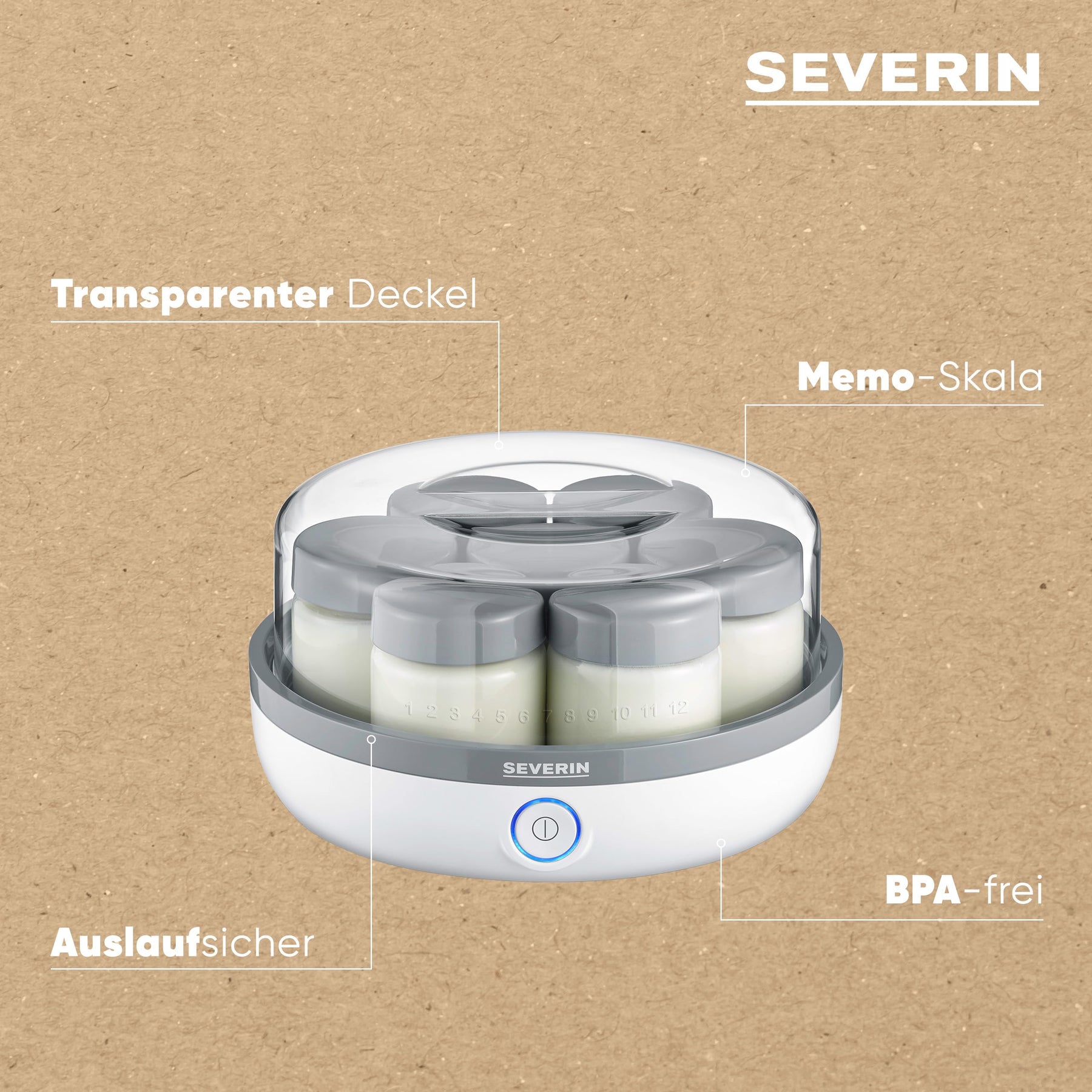 Einzelheiten: LECKERER UND GESUNDER JOGHURT. EINFACH UND UNKOMPLIZIERT SELBST GEMACHT. DANK 14 GLÄSER AUCH IN GROSSEN MENGEN. Idealer Genuss für morgens oder zwischendurch - mit dem praktischen Joghurtbereiter JG 3520 können Sie schnell und einfach für ausreichend Nachschub im Kühlschrank sorgen und das, dank der 14 Portionsgläser, sogar in großen Mengen. Mit dem praktischen Deckel kann der Fermentierprozess problemlos beobachtet werden und dank des auslaufsicheren Deckels sind die 14 Portionsgläser à 150 ml auch perfekt für Unterwegs geeignet. Für einen einwandfreien Genuss ist sichergestellt, dass alle mit Lebensmittel in Berührung kommenden Teile 100% BPA-frei sind.