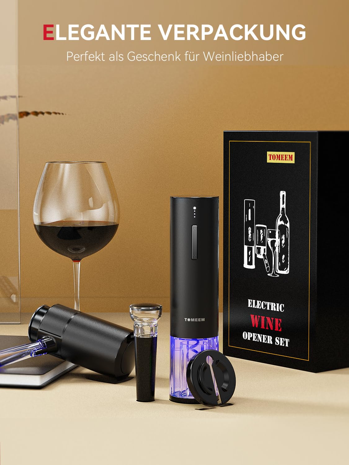 Einzelheiten: TOMEEM Korkenzieher elektrische, Premium Box mit Belüfter, Vakuumverschlüss, Folienschneider, Ausgießer, Weinöffner Set für Geschenk zu Weihnachten, Weinliebhaber (Schwarz)