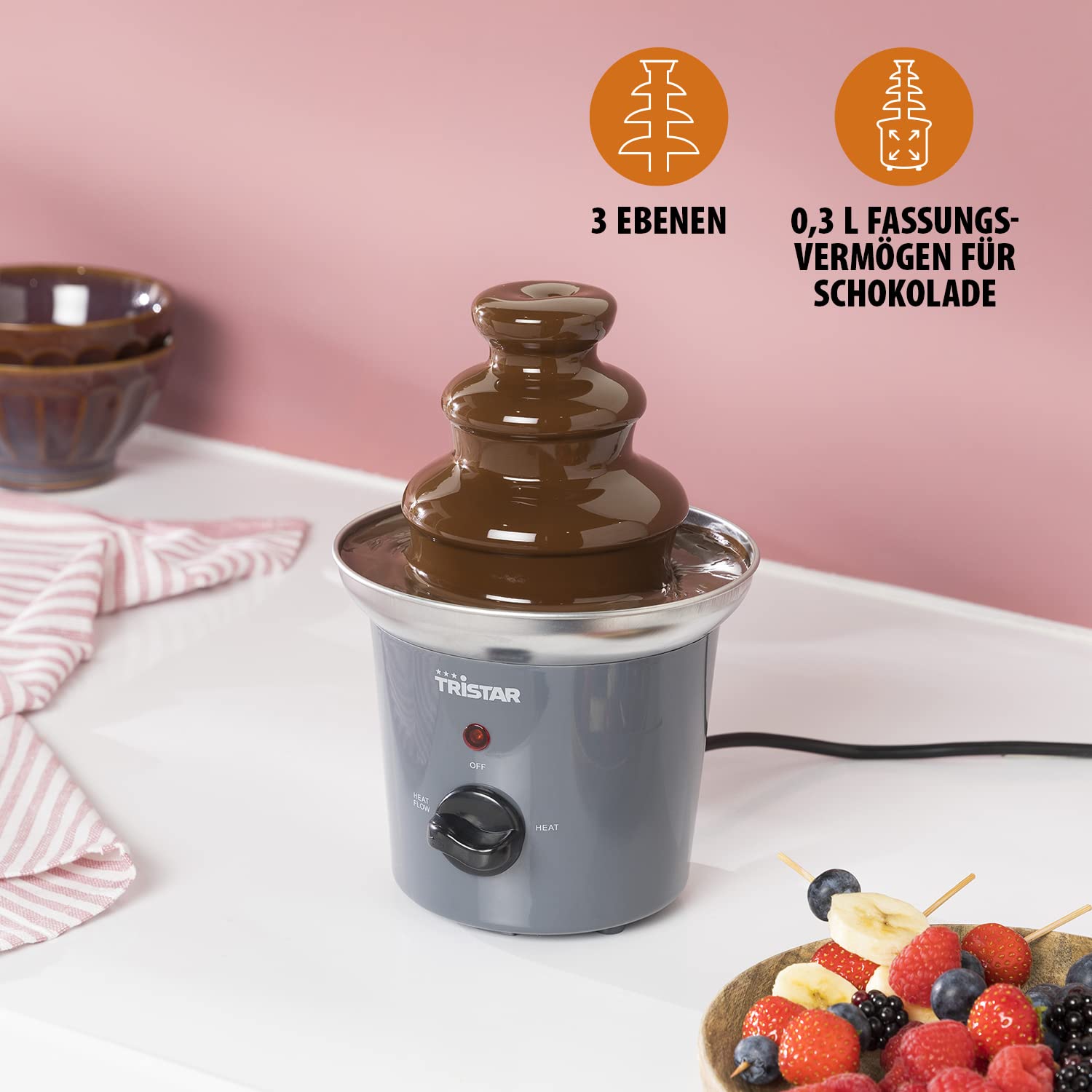 Gründe zur Auswahl des Tristar CF-1603 Schokoladen Brunnens: Mit diesem Schoko Brunnen wird jede Party noch festlicher Im Gebrauch vielseitig, denn er eignet sich für Obst, Kekse, Pfannkuchen, Eiscreme usw. Dank seines kompakten Formats nach dem Gebrauch leicht verstaubar Noch längerer Schokobrunnen-Genuss dank der Warmhaltefunktion Solider Turm aus Edelstahl mit Spirale und zwei Ebenen