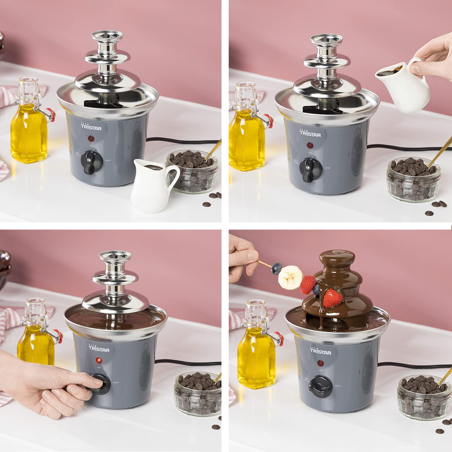 Der Tristar CF-1603 Schokoladen Brunnen ist sehr einfach zu benutzen. Einfach den Brunnen einschalten, damit sich dieser aufheizen kann. Bringen Sie dann etwas Schokolade im Mikrowellenofen oder im Wasserbad zum Schmelzen. Gießen Sie die Schokolade auf den Brunnen und schon kann der Schokospaß beginnen! Von einer rotierenden Edelstahlspirale wird die Schokolade nach oben gepumpt und strömt dann nach unten. Sie können deshalb alles in die Schokolade eintauchen, was Sie möchten.