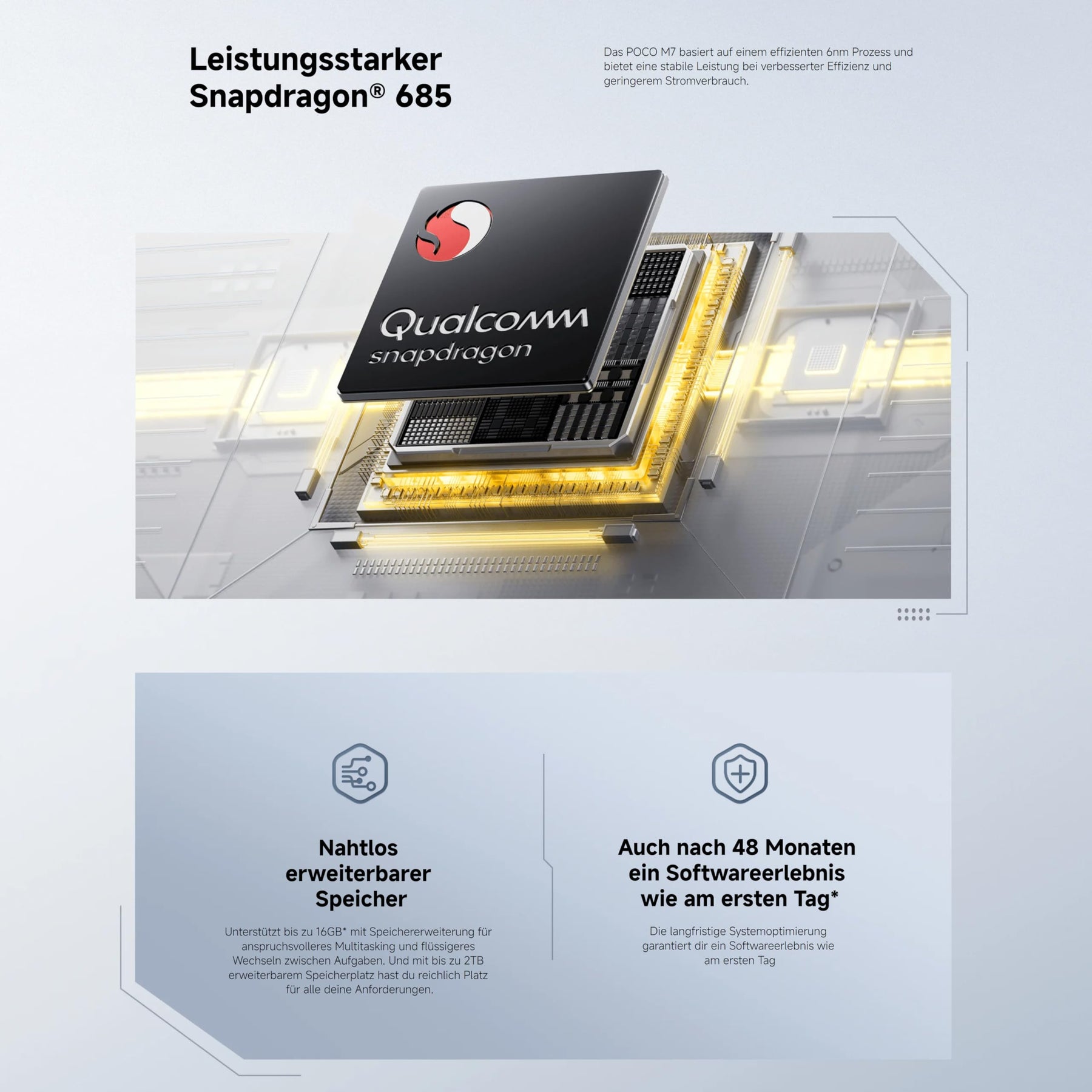 - 【Leistungsstarker Snapdragon 685 Prozessor】Das POCO M7 basiert auf einem effizienten 6nm Prozess und bietet eine stabile Leistung bei verbesserter Effizienz und geringerem Stromverbrauch.