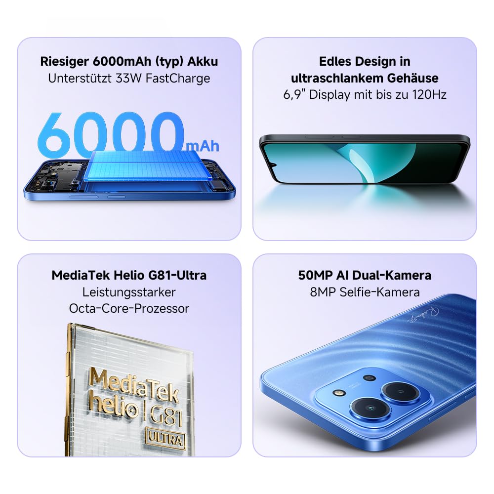 - 【Leistungsstarker Octa-Core-Prozessor – Stetig flüssige Performance】Der MediaTek Helio G81-Ultra Octa-Core-Prozessor vereint niedrigen Energieverbrauch mit hoher Leistung und sorgt so selbst bei längerer Nutzung für ein flüssiges Erlebnis.