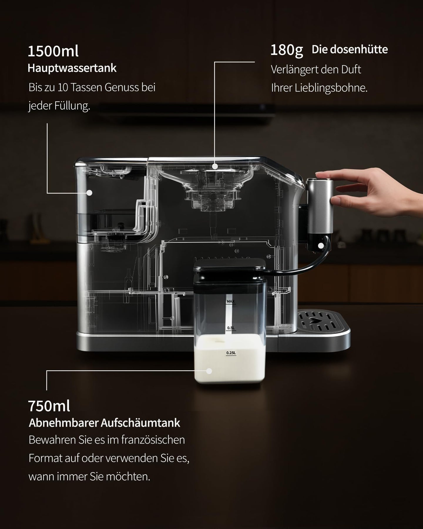 • 【Milchschaum richtig gemacht】Nutzen Sie frische Vollmilch (5–7°C) und halten Sie Auslass & Schlauch sauber – für dichten, stabilen Schaum.