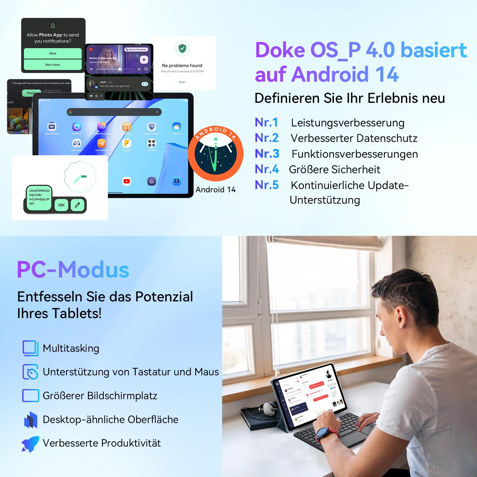 - 【DokeOS_P 4.0 Tablet,】Das 11-Zoll Android 14 Tablet mit DokeOS_P 4.0 bietet eine flüssigere Bedienung und benutzerfreundlichere Interaktion. Es wurde in den Bereichen Leistung, Geschwindigkeit, Sicherheit und Datenschutz umfassend verbessert. Der 8200 mAh Akku sorgt für eine lange Nutzungsdauer und ermöglicht das stressfreie Genießen von Filmen, E-Books und Musik den ganzen Tag. Verabschiede dich von der Akkuangst. Das Tab90-Tablet ist GMS-zertifiziert