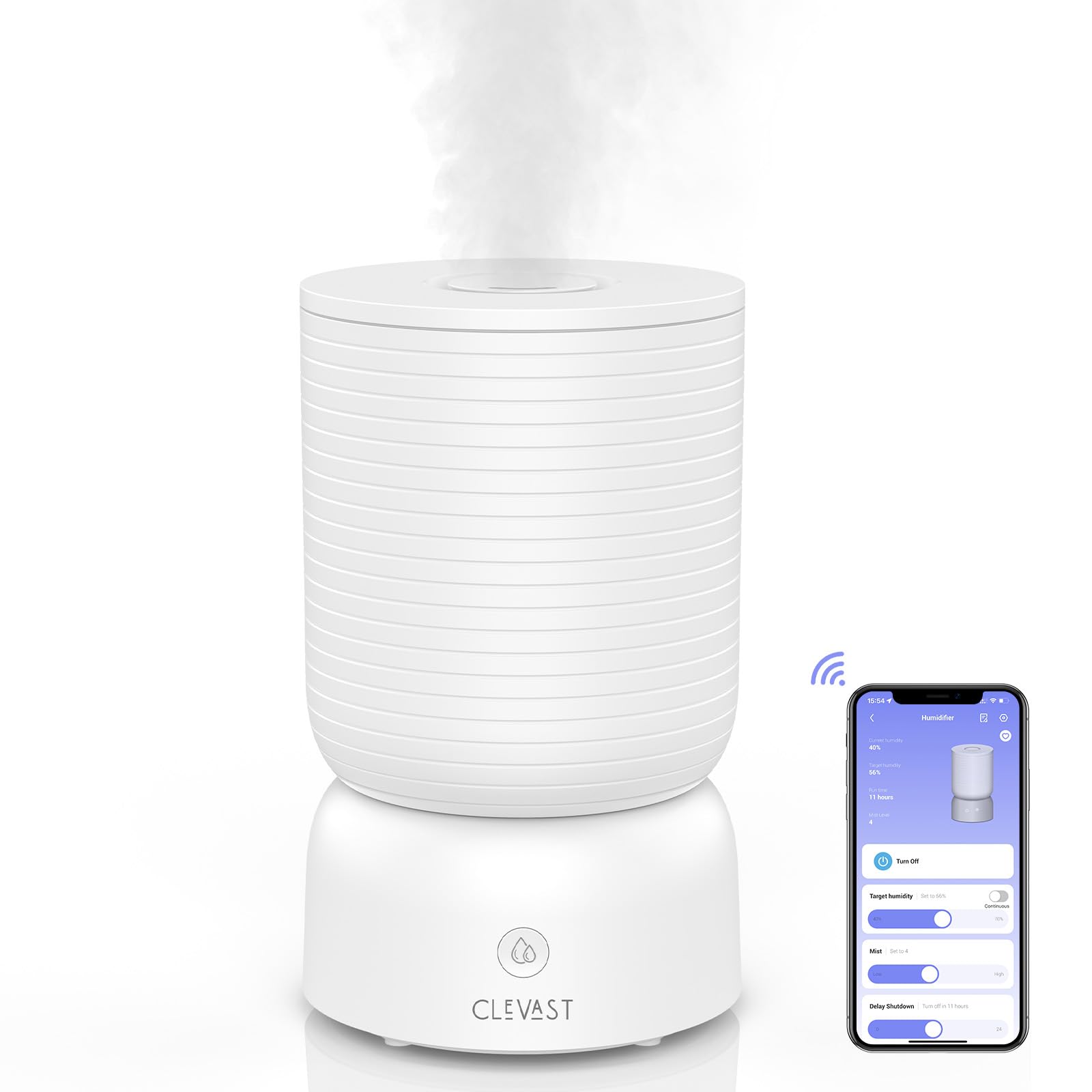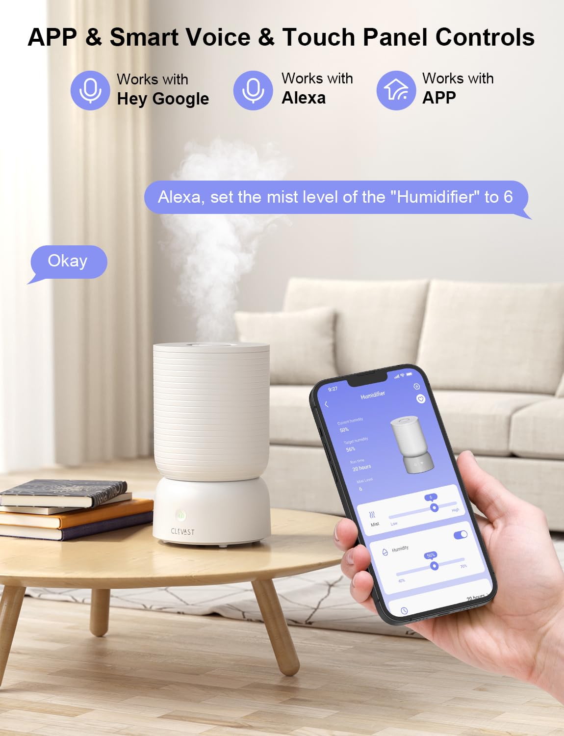 - App & Sprach & Touch-Steuerung: Steuern Sie unseren Luftbefeuchters jederzeit und überall mit der CLEVAST APP. Schalten Sie den Luftbefeuchter leicht ein und aus, justieren Sie die Feuchtigkeitsstufen und Nebelintensität und stellen Sie einen Befeuchtungstimer ein. Es funktioniert auch mit Alexa und Google Assistant für Sprachsteuerung.