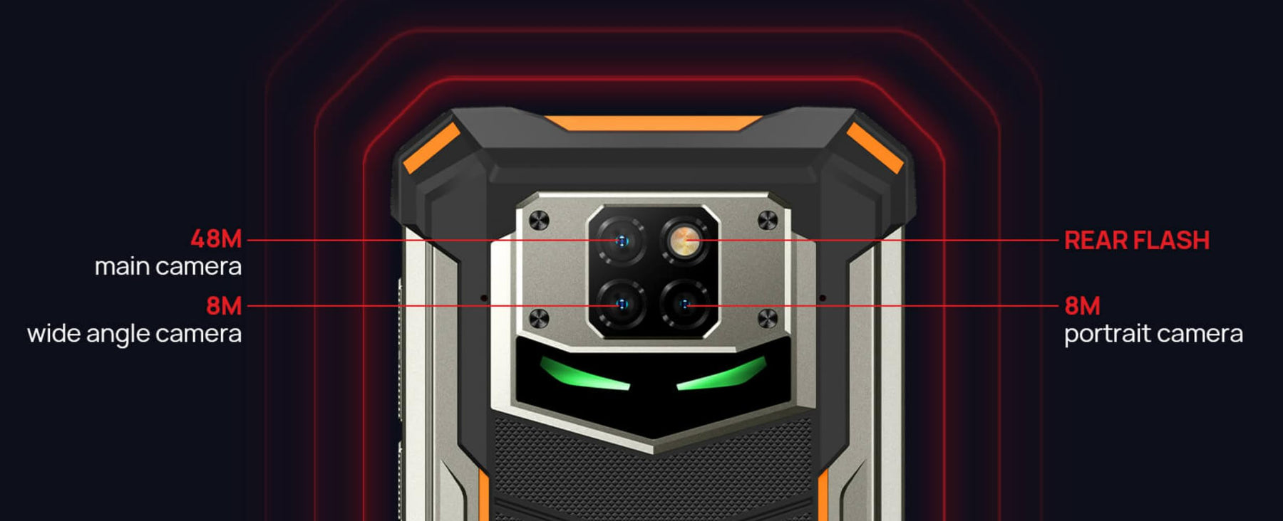 - ★ Iron Man Eye Design – Die einzigartige Multifunktions-LED: Die LED-Leuchte unter dem schwarz-transluzenten gehärteten Glas ist ein wegweisendes Design von DOOGEE. Sie fungiert als Atemlicht, das bei Anrufen, Nachrichten und anderen Benachrichtigungen aufleuchtet.