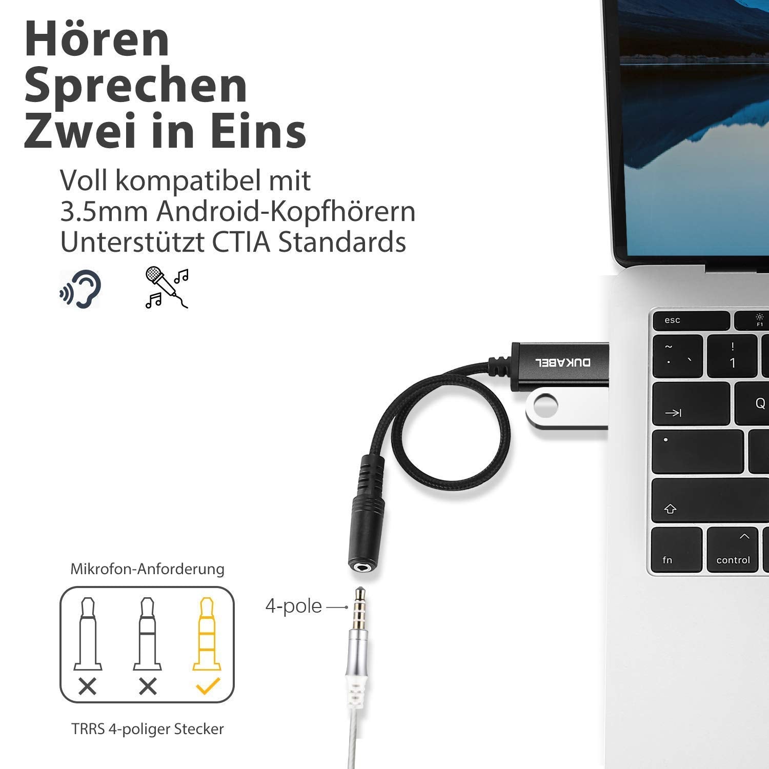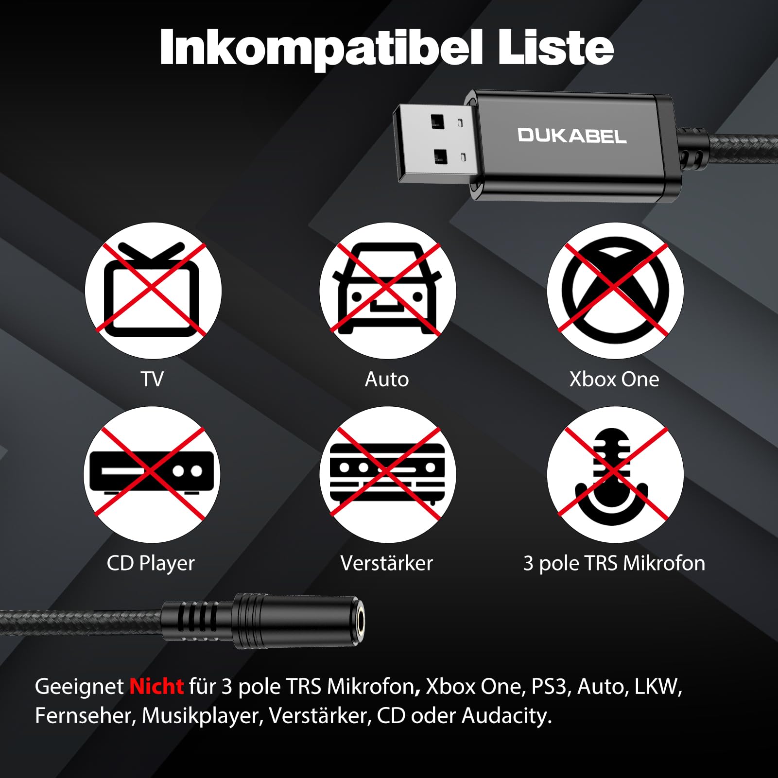 - Inkompatibilitätsliste: DuKabel USB auf Klinke Adapter ist nicht geeignet für Apple Standard Headset. Es ist nicht kompatibel mit TV, Fernseher, Xbox One, PS3, Auto, LKW, 3 pole TRS Mikrofon, Verstärker, CD und Audacity.