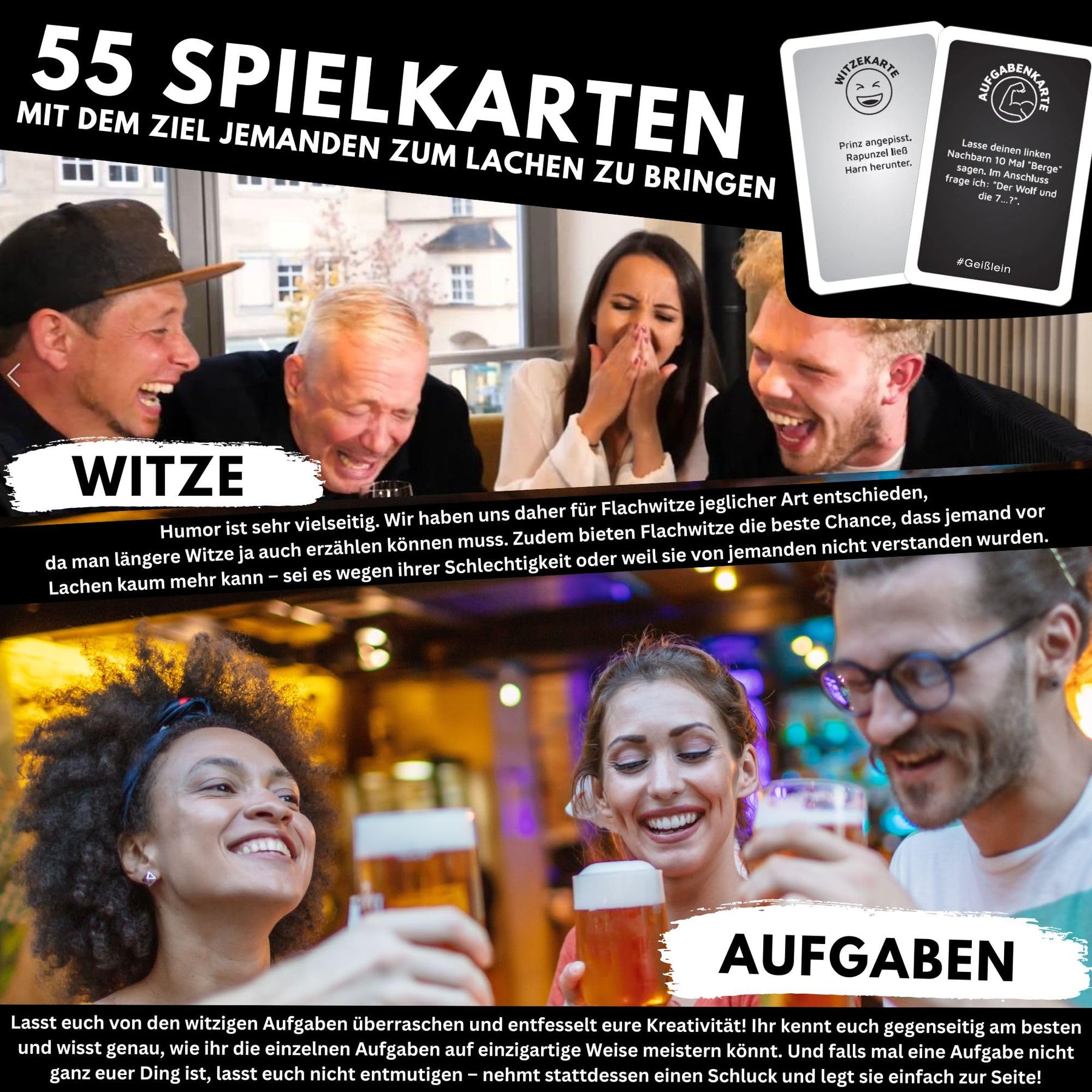 - 🙊 Es gibt zwei Kategorien – Witzekarten und Aufgabenkarten. Bei Witzekarten lest ihr den Witz vor und bei Aufgabenkarten setzt ihr die Karte entsprechend um. Seid kreativ!
