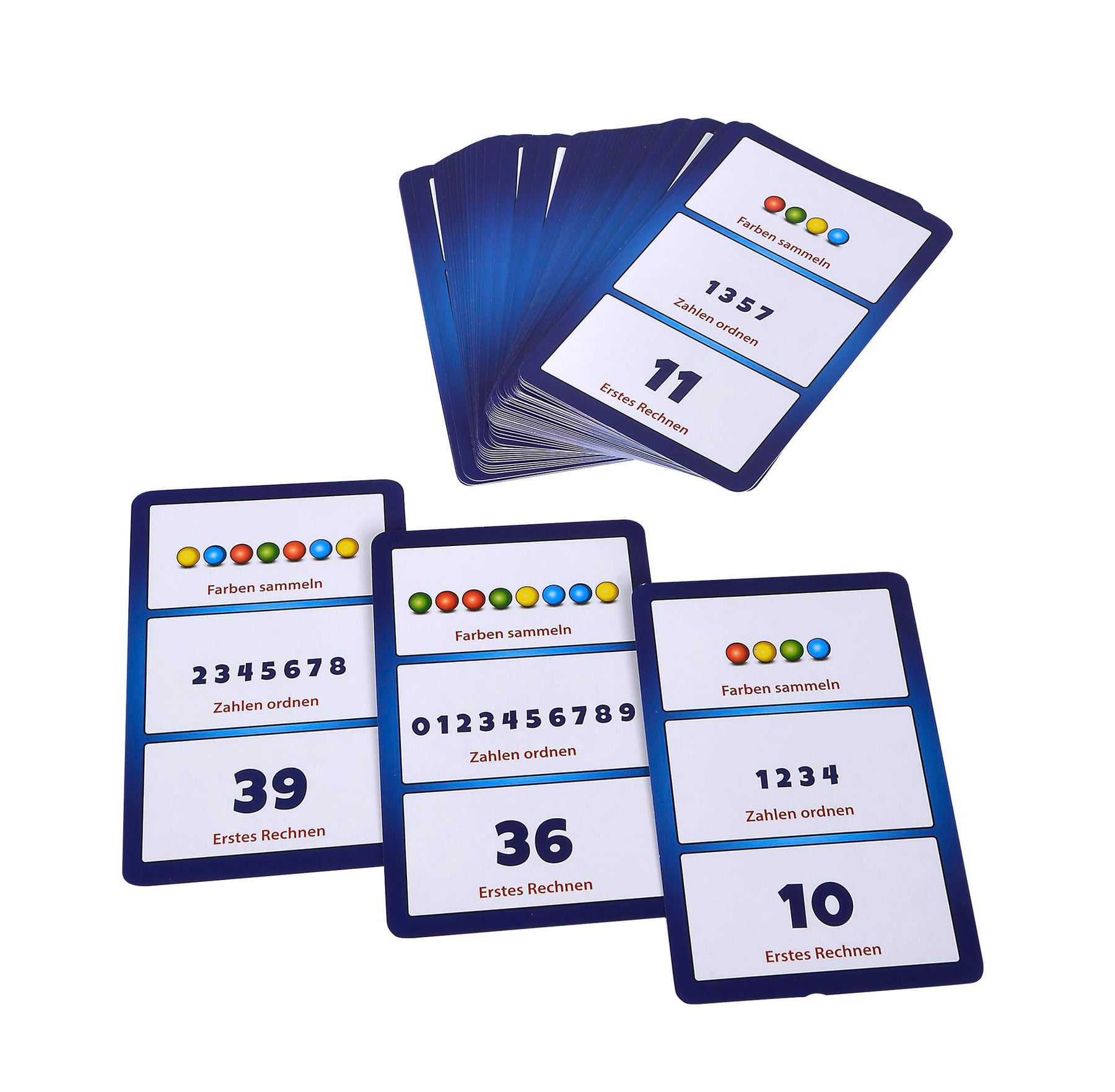 Beim rasanten Kugel-Wettbewerb versuchen die Spieler mit einer Röhre Murmeln in einer bestimmten Reihenfolge einzusammeln. Die Kugeln haben verschieden Farben und Nummern aufgedruckt, Spielkarten geben die Aufgabe vor. Drei verschiedene Schwierigkeitsgrade bringen Klein und Groß bei diesem Spiel mit Lern-Effekt mächtig ins Schwitzen! Bei Stufe eins gilt es die bunten Kugeln in der richtigen Farb-Reihenfolge aufzusammeln, bei der zweiten Schwierigkeitsstufe sind die auf den Murmeln aufgedruckten Zahlen ausschlaggebend. Richtig anspruchsvoll wird es, wenn die Spielkarten Rechenaufgaben zeigen und die Ergebnisse dann mit den Murmeln aufgesammelt werden müssen.
