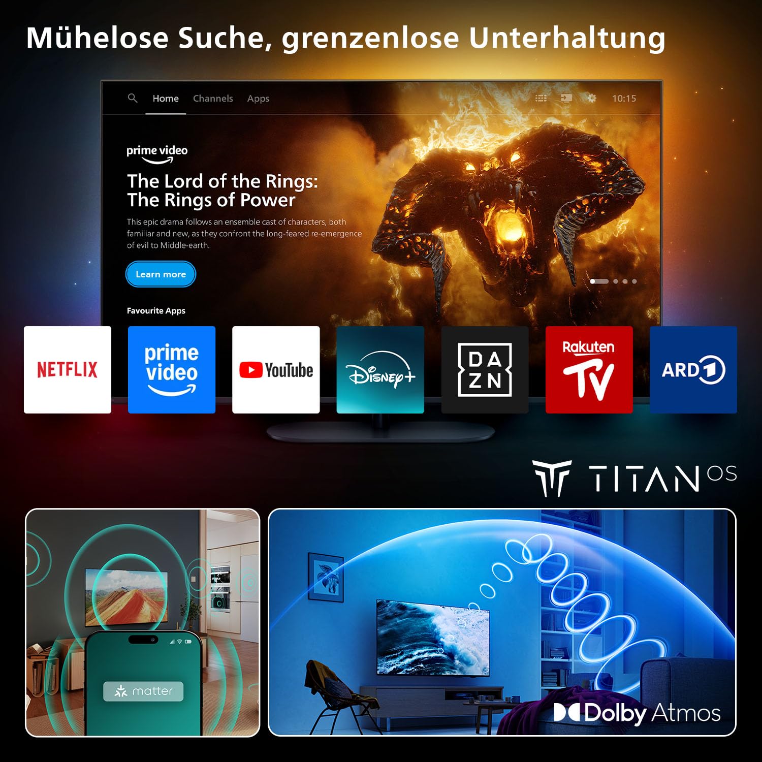 - Titan OS: Mit unserer Titan OS intelligenten TV-Plattform finden Sie im Nu Ihre Lieblingssendungen. Folgen Sie Serien direkt von Ihrem Startbildschirm. Durchstöbern Sie die Kategorien und Vorschläge der besten Streaming-Services an einer Stelle