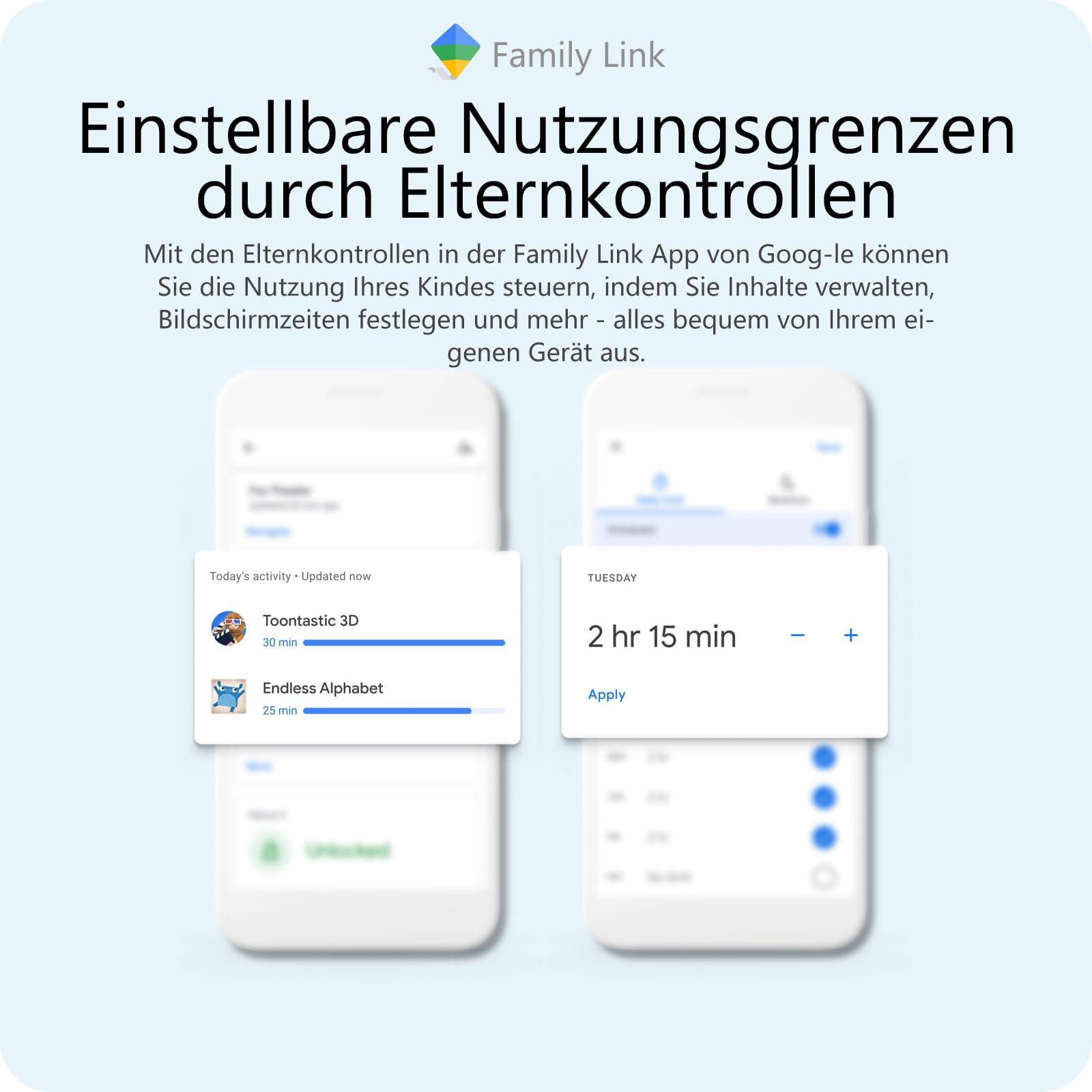 - Elternkontrollfunktion: Eltern können über *Family Link* auf ihrem Smartphone ganz einfach Apps verwalten und die Bildschirmzeit ihres Kindes aus der Ferne steuern. Mit einer sicheren Browserfunktion wird gewährleistet, dass Kinder keine unangemessenen Websites besuchen. Das Tablet unterstützt Dual-Band-Wi-Fi (2,4/5 GHz) für eine schnelle und stabile drahtlose Verbindung.